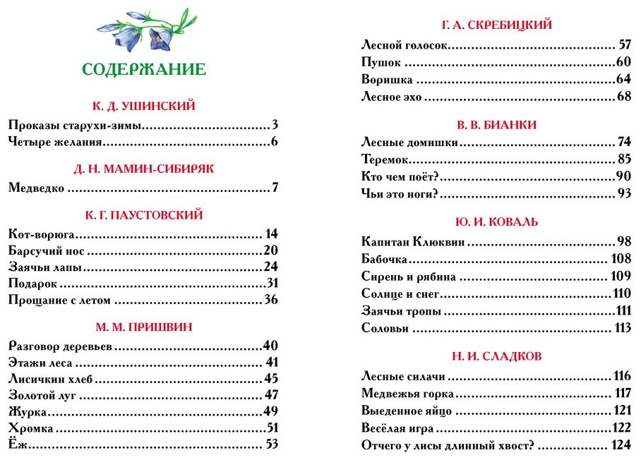 В книгу вошли произведения: К. Ушинского "Проказы старухи зимы", "Четыре желания", Д. Мамина-Сибиряка "Медведко", К. Паустовского "Кот Ворюга", "Барсучий нос", "Заячьи лапы", "Подарок", "Прощание с летом", М. Пришвина "Разговор деревьев", "Этажи леса", "Лисичкин хлеб", "Золотой луг", "Журка", "Хромка", "Еж", Г. Скребицкий "Лесной голосок", "Пушок", "Воришка", "Лесное эхо", В. Бианки "Лесные домишки", "Теремок", "Кто чем поет?", "Чьи это ноги?", Ю. Коваль "Капитан Клюквин", "Бабочка", "Сирень и рябина", "Солнце и снег", "Заячьи тропы", "Соловьи", Н. Сладков "Лесные силачи", "Медвежья горка", "Выеденное яйцо", "Веселая игра", "Отчего у лисы длинный хвост?".