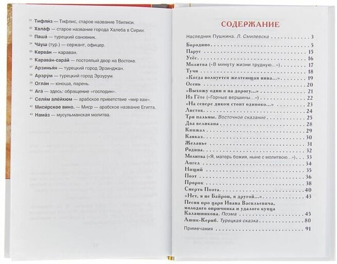 Отличный сборник М.Ю.Лермонтова, в котором собраны самые известные его стихотворения (все они входят в школьную программу), а также поэма «Песнь о купце Калашникове», уникальная для того времени (никто из современников Лермонтова не писал поэмы в древнерусском стиле), и даже проза — интерпретация народной турецкой сказки об Ашик-Керибе. Так как сборник предназначен для школьников, в нём присутствуют красочные иллюстрации. Для школьников же в конце расположен список примечаний, объясняющий непонятные термины.