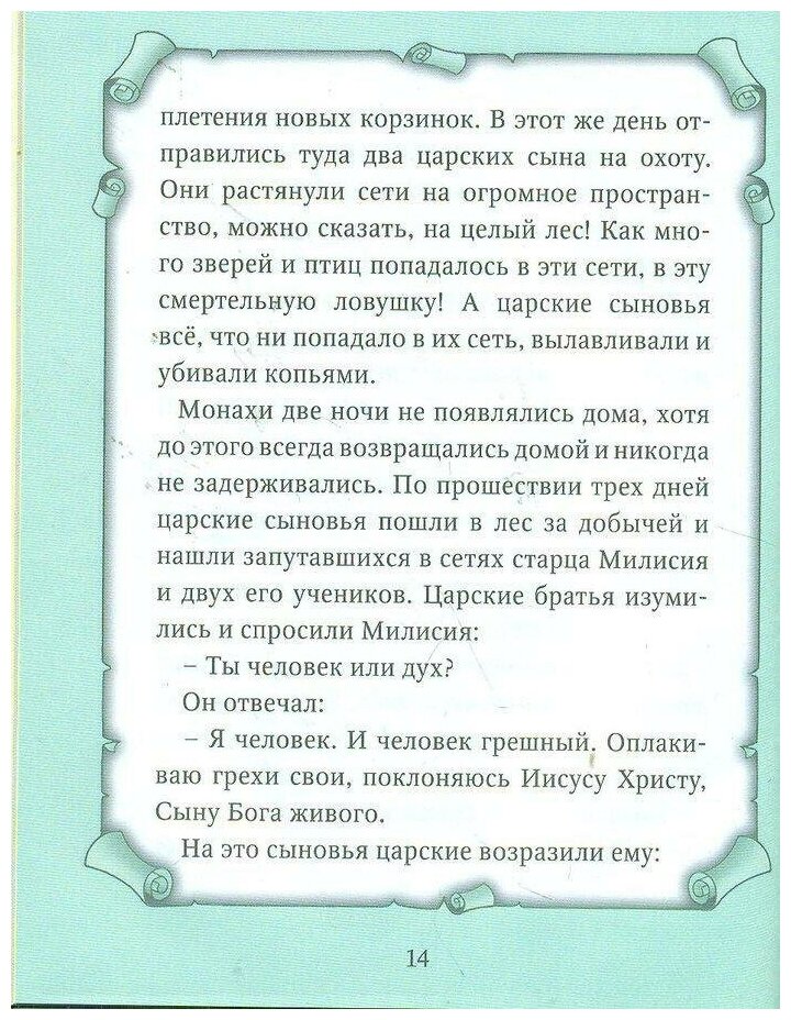 Каждый рассказ примерно на 2 страницы, иллюстрация встречается примерно через разворот, иногда на каждом развороте (нам это было важно, т.к. ребенку 4.5 года и увлечь книгой без множества иллюстраций довольно таки сложно). К счастью, дочке понравилось и она каждый вечер просит почитать зеленую книгу про добрых людей. В основном, это истории о жизни монахов. Есть о деяниях таких великих угодников Божиих, как Антоний и Макарий Великие, Спиридон Тримифунтский и другие.