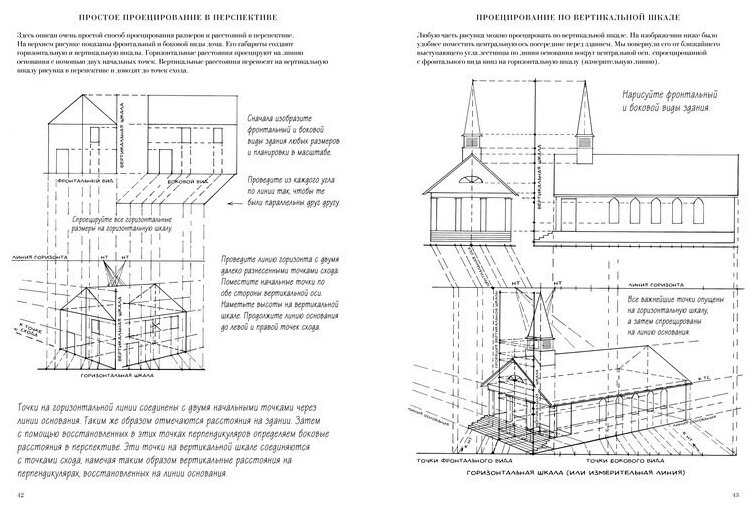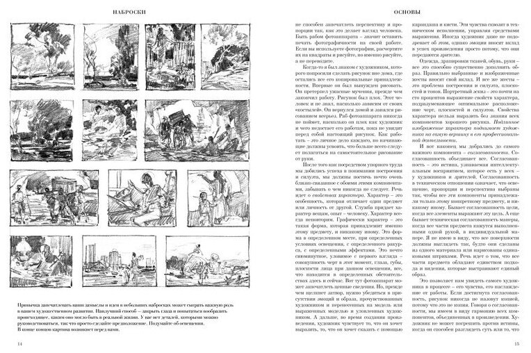 Например,на стр 12:"Следующим важным этапом будет строение. Надо собирать фотографии,делать по ним наброски и эскизы..." или на стр.17:"Строение. Попытка изобразить формы с натуры или при помощи базовых знаний"