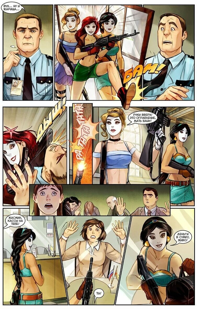 Пожалуй, что эта сюжетная арка получилась довольно скучной - очень мало действий и накала страстей от выпуска к выпуску, хотя детектив тут весьма неплохой. Итак, в городе происходит серия дерзких ограблений, где девушки - грабители наряжаются в костюмы диснеевских принцесс, а доблестному майору Грому надо их поймать. Если вы поклонник "Форсажа" или фильмов "Такси", то от сцен гонок у вас и впрямь поедет крыша. Рисунок весьма способствует передаче динамики, хоть и упростили детали. Но тем не менее, за что я полюбил Грома тут нет - интеллектуального противостояния героя и антагониста. Тем не менее рекомендую к прочтению.