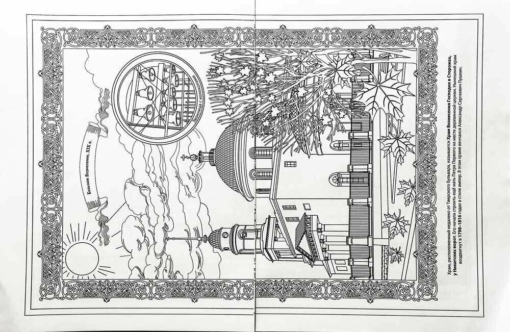 Сложные, тонкие, высокого уровня качества раскраски для детей старше 7 лет, знакомящие читателей с великими храмами Москвы. Каждый рисунок снабжен краткими пояснениями, в частности, о годах постройки (перестройки) здания.