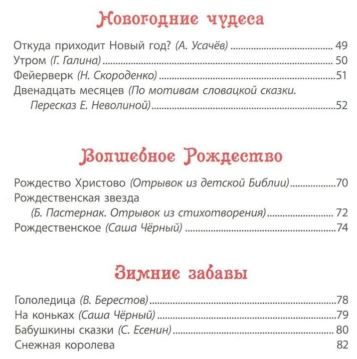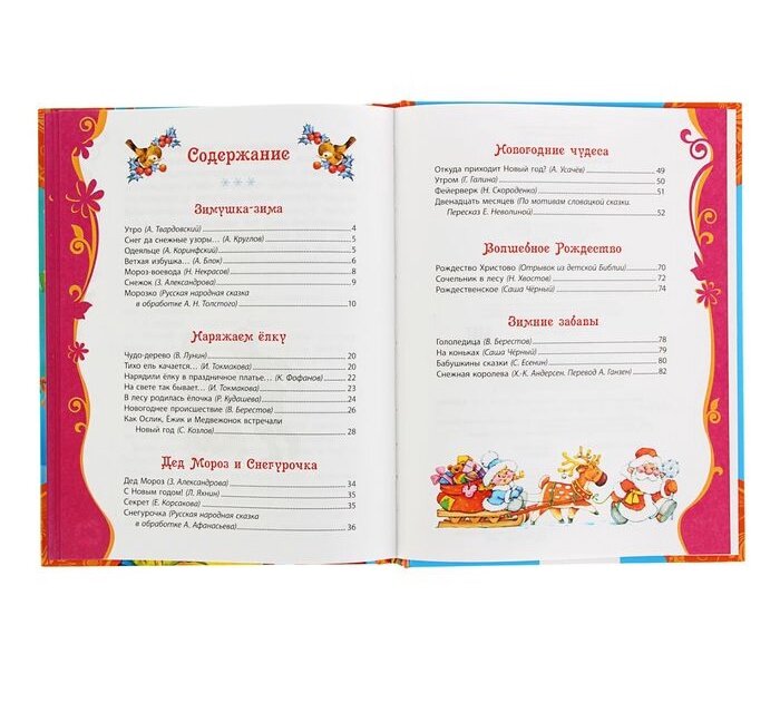 В этой большой новогодней книге собраны замечательные произведения о зиме, новогодних чудесах и ёлочке, Дедушке Морозе и Снегурочке, зимних забавах и, конечно, Рождестве. «Снежная королева» Х.-К. Андерсена, русские народные сказки, стихотворения А. Блока, Н. Некрасова, А. Толстого, А. Твардовского, А. Усачёва, Саши Чёрного и других классиков детской литературы красочно проиллюстрированы талантливыми художниками и переносят нас в мир новогодних чудес. Эта семейная книга для детей, их родителей, бабушек и дедушек подарит удовольствие от чтения увлекательных произведений в уютном домашнем кругу.