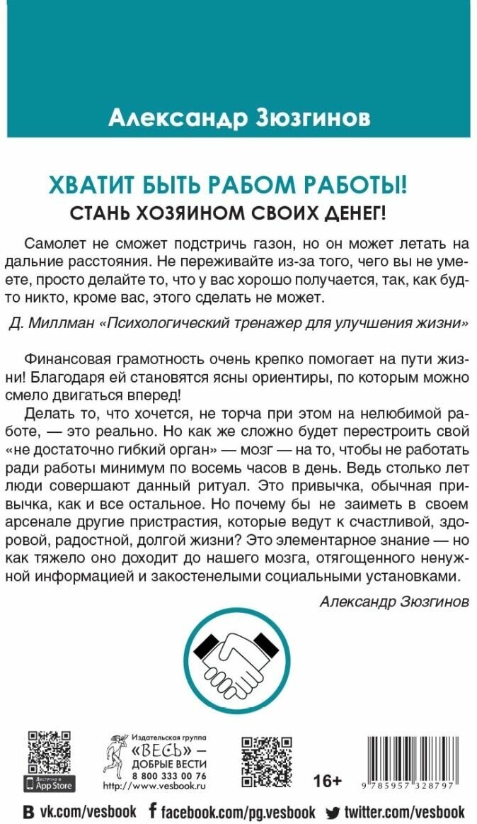 На сегодняшний день товар «Книга: Хватит быть рабом работы! Стань хозяином своих денег! (Зюзгинов Александр Николаевич); Весь, 2019» можно купить с кешбеком в 4 магазинах: book24, Буквоед, Читай-город, Яндекс.Маркет