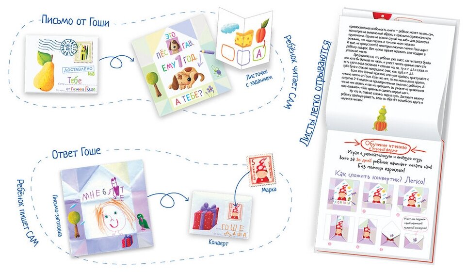 В блокноте представлен уникальный метод обучения чтению. Это 30 волшебных писем от гномика Гоши, адресованных ребёнку. Ребёнок читает их сам, без помощи взрослых. Родителям нужно просто каждый вечер незаметно класть готовое письмо под подушку спящего ребёнка. Уровень сложности рассчитан на детей, которые знают буквы и умеют читать простые слоги. При желании гномику можно написать ответ. Для этого в блокноте есть готовые письма-конверты и марки-наклейки. Также в письмо можно дополнительно вложить листочек с интересным заданием. Издание адресовано детям от 4 лет.