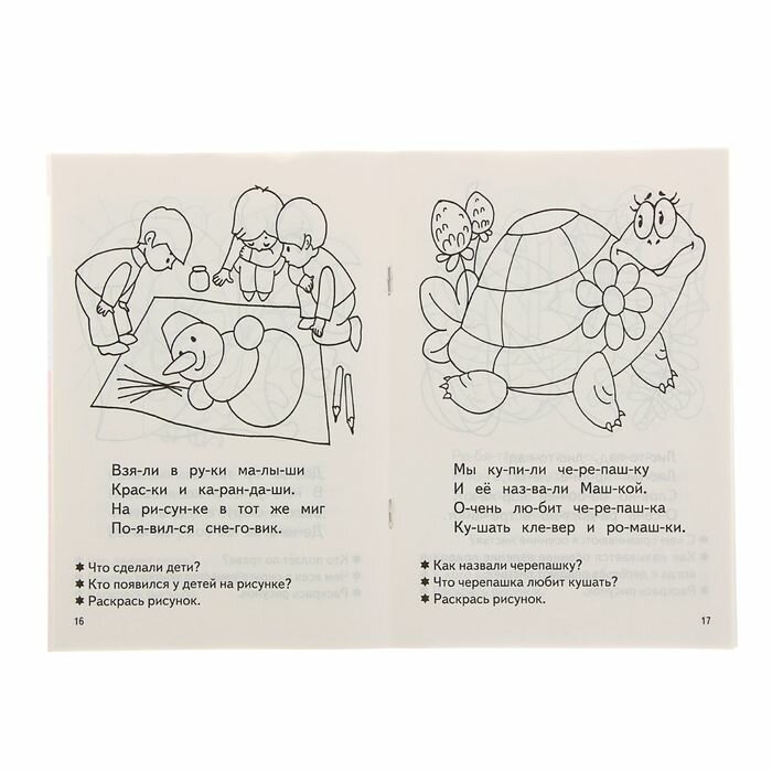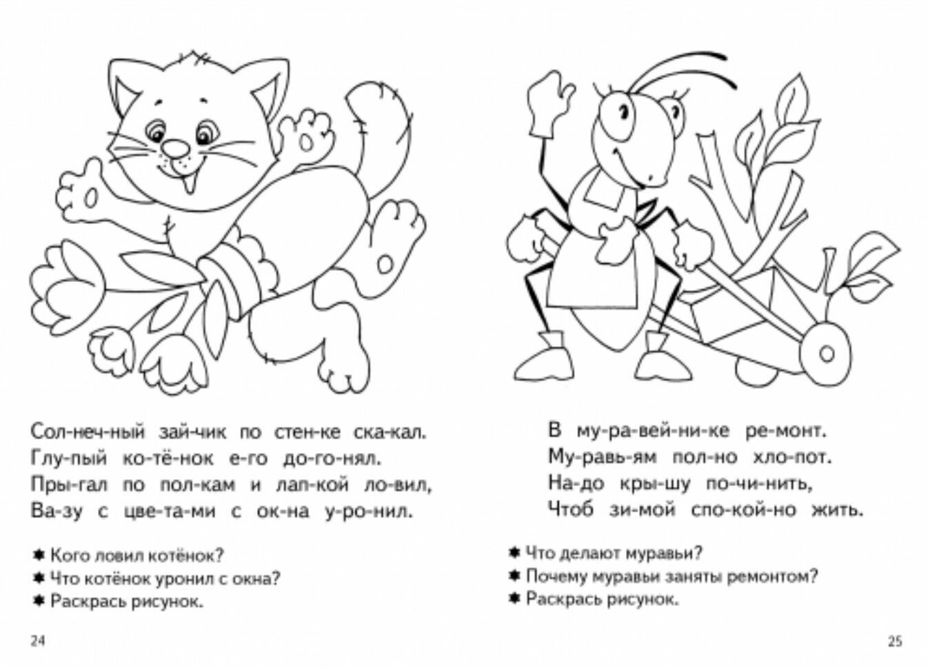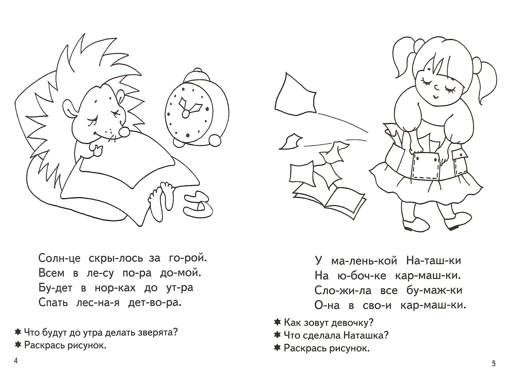 Уважаемые родители и педагоги! Предлагаем Вашему вниманию задания по развитию навыков чтения, которые помогут ребенку успешно подготовиться к школе. Эта тетрадь предназначена детям, которые знают все буквы и начинают читать. Она составлена так, чтобы не вызвать у ребенка, только-только начавшего читать по слогам, отрицательного отношения к чтению, а наоборот, привить любовь к этому занятию. На каждом развороте представлен занимательный текст в стихотворной форме, которая помогает быстрее овладеть навыком чтения. Все слова в стихотворении разделены на слоги, что помогает ребенку плавно переходить от слогового чтения к чтению целыми словами. Для создания яркого впечатления от прочитанного каждое стихотворение проиллюстрировано рисунком, который предлагается раскрасить цветными карандашами. После каждого стихотворения задаются вопросы на понимание прочитанного, что развивает у ребенка осознанность чтения и связную речь. Тетрадь рассчитана на совместную работу взрослых и детей. Она может быть использована в детских дошкольных учреждениях.