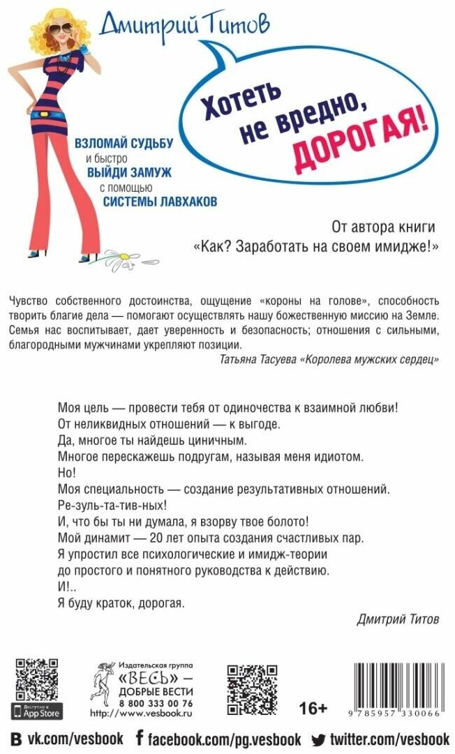 Хотеть не вредно дорогая Взломай судьбу и быстро выйди замуж. Написано с юмором. Уже приятно. А то надоели скучные советы как поймать- удержать- выйти замуж. Как будто это панацея. Суть книги Дмитрия Титова - во взломе программы, изменении психологии, взгляда на мир и брак. Тоже не ново, но написано интересно и понятно, должно работать. Система лайфхак мне помогла уже в работе.