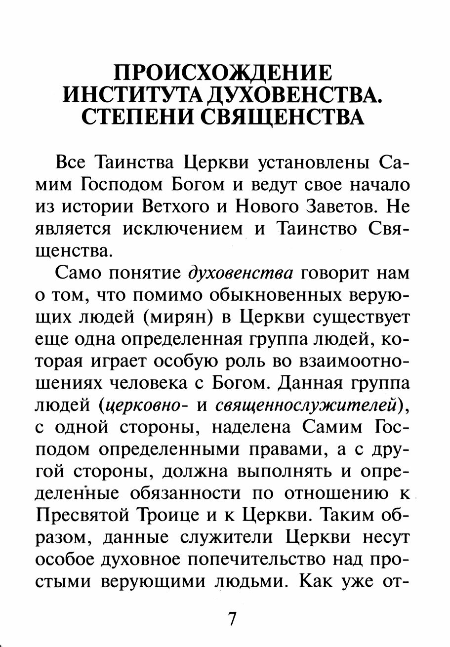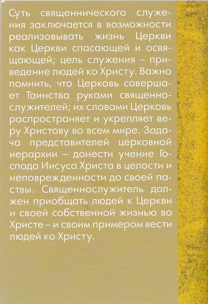 В книге рассказывается об истории установления, сущности и чинопоследовании Таинства Священства; о требованиях к кандидатам в священнослужители и препятствиях к рукоположению; правах и обязанностях священнослужителей, их роли и значении для всей Церкви и каждого православного христианина. Издание рассчитано на широкий круг православных читателей.