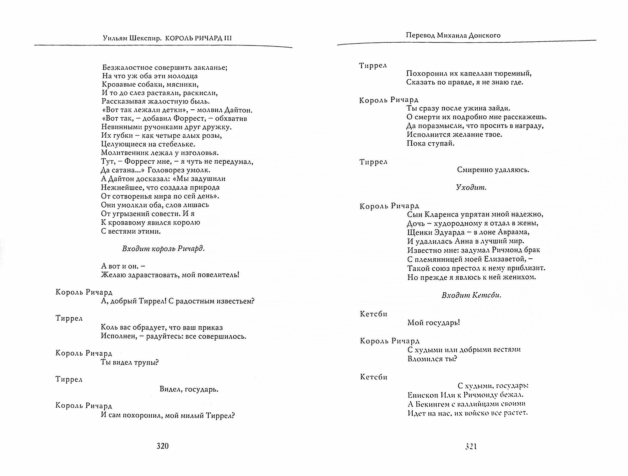 Это пятая книга издательства ПРОЗАиК в серии русских переводов шекспировских трагедий. Первая, которую я купила, но постараюсь приобрести другие (хотя бы "Макбета" и "Короля Лира"), потому что книга издана замечательно. Очень красивая, стильная, переплёт похож на тканевый, с серебряным тиснением. Чёрно-красно-серебряные переплёт и суперобложка и белая, чуть просвечивающая бумага. Без иллюстраций. Что касается содержания, то это чаще всего встречающиеся переводы Дружинина и Донского, а третий перевод - не Анны Радловой, как можно было бы ожидать, а малоизвестный перевод Вильгельма Кюхельбекера. Оказывается. это был первый полный перевод на русский язык "Ричарда III", "но так как автор-декабрист отбывал заключение в крепости. то опубликован этот перевод будет лишь полтора столетия спустя"( цитата из предисловия Игоря Шайтанова). Серия эта выпускается в рамках программы "Культура России", соответственно финансово поддерживается государством, и в данном случае за издательство и за выпускаемую им продукцию можно только порадоваться.
