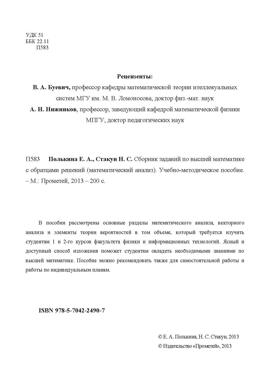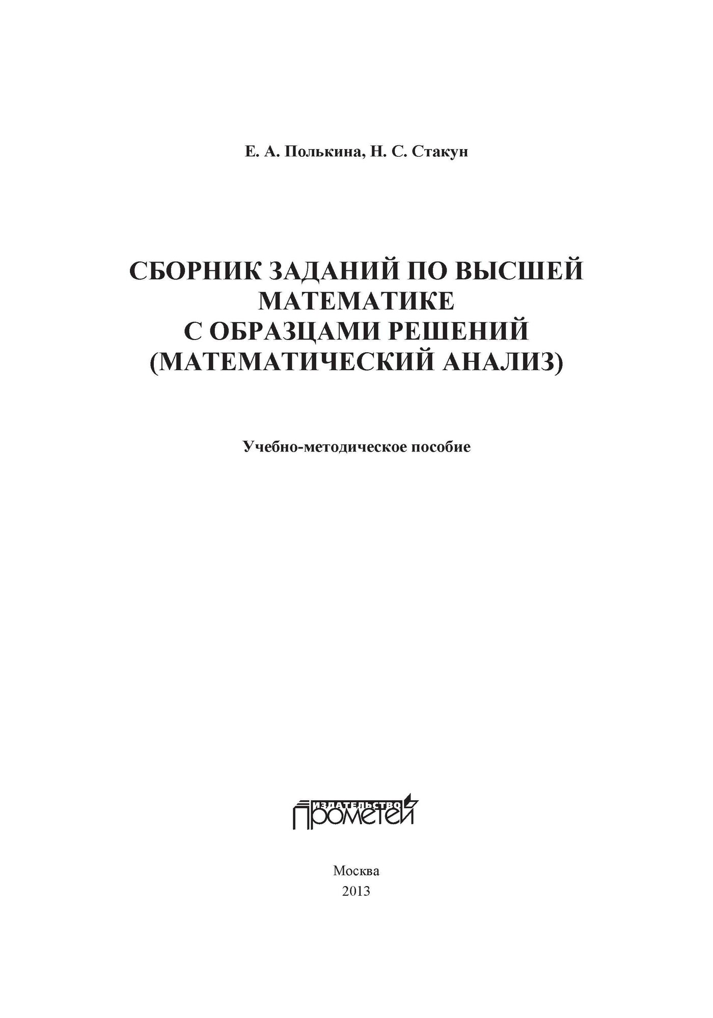 Сборник заданий по высшей математике с образцами решений (математический анализ). Учебно-методическое пособие (Полькина Е. А., Стакун Н. С.); Прометей, 2013