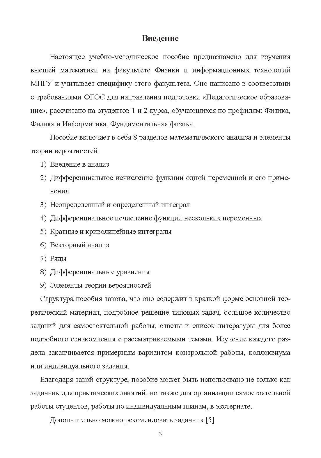 В пособии рассмотрены основные разделы математического анализа, векторного анализа и элементы теории вероятностей в том объеме, который требуется изучить студентам 1 и 2-го курсов факультета физики и информационных технологий. Ясный и доступный способ изложения поможет студентам овладеть необходимыми знаниями по высшей математике. Пособие можно рекомендовать также для самостоятельной работы и работы по индивидуальным планам.