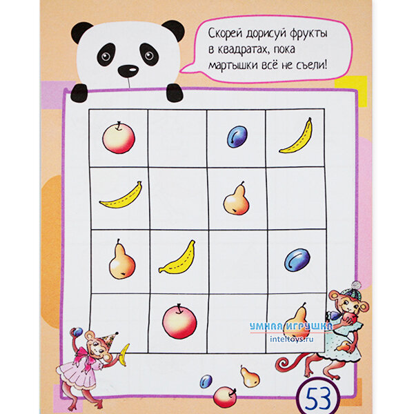 Есть классические задания на цифры с полем 9х9, но это в конце. Задания в блокноте построены по принципу от лёгкого к сложному. С цифрами есть задания с полем 4х4, 6х6. А так же задания с рисунками, цветами, буквами, точкам, геометрическими фигурами. В общем, на любой вкус.