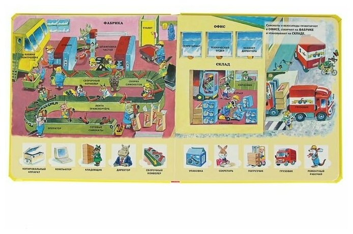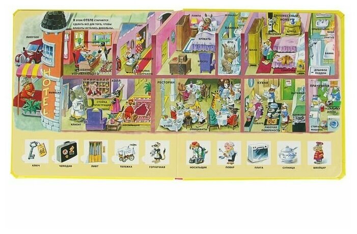 Всего в книге 6 разворотов - на улице, в аэропорту и на вокзале, музей-галерея-кинотеатр-детская площадка, супермаркет, фабрика и отель. На страницах размещены различные окошки. Одни размещены на полях и изображают какой-либо предмет. Отрыв окошко, можно увидеть, как этот предмет работает, применяется (например на окошке нарисована коляска, открыв клапан мы видим малютку, открыв клапан с пешеходным переходом, видим. Как по нему переходят дорогу зайчата с мамой, под окошком с изображением такси – нарисованы его пассажиры и т.д.) Другие окошки размещены непосредственно на картинке. Очень интересно отыскивать эти окошки и заглядывать в них. Вот, например, едет скорая помощь, открыв окошко, мы видим, что в ней везут заболевшего енота. Заглянув под клапаны на борту самолета, мы видим пилота в кабине, слона в пассажирском кресле, ежа, входящего в самолет. А еще можем посмотреть, кого везут в грузовом вагоне, чем занимаются пассажиры в ожидании поезда, кто пришел в библиотеку, куда спрятался слоненок в магазине и пр. Окошки небольшие, открывать удобно маленьким, но, перед первым чтением с ребенком, советую самостоятельно их открыть (лучше с помощью зубочистки, чтобы не повредить). Текста нет, рассказы по картинкам придумываем сами, вспоминаем, где мы видели эти предметы или события в нашей жизни, как мы поступаем.
