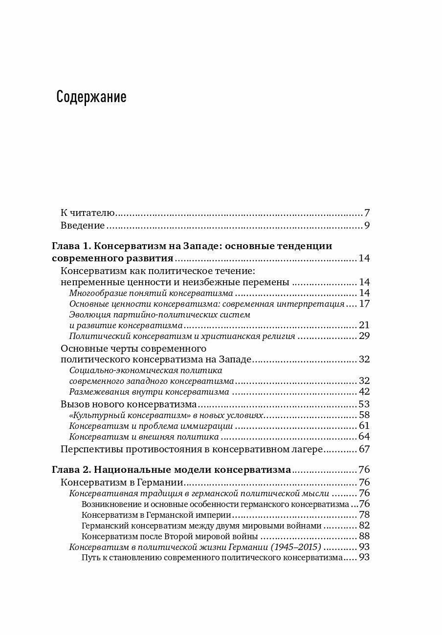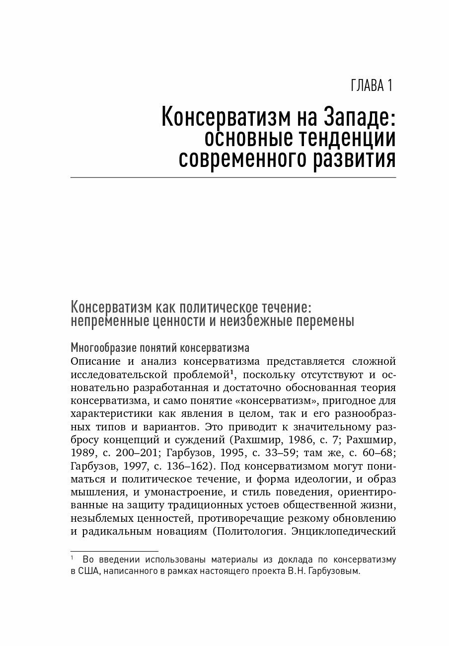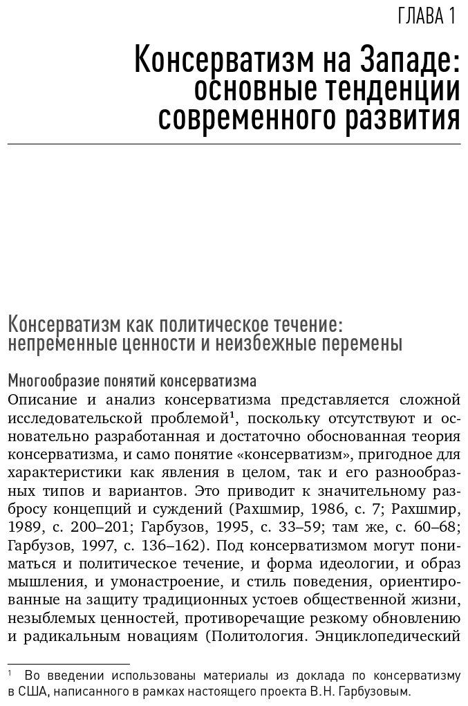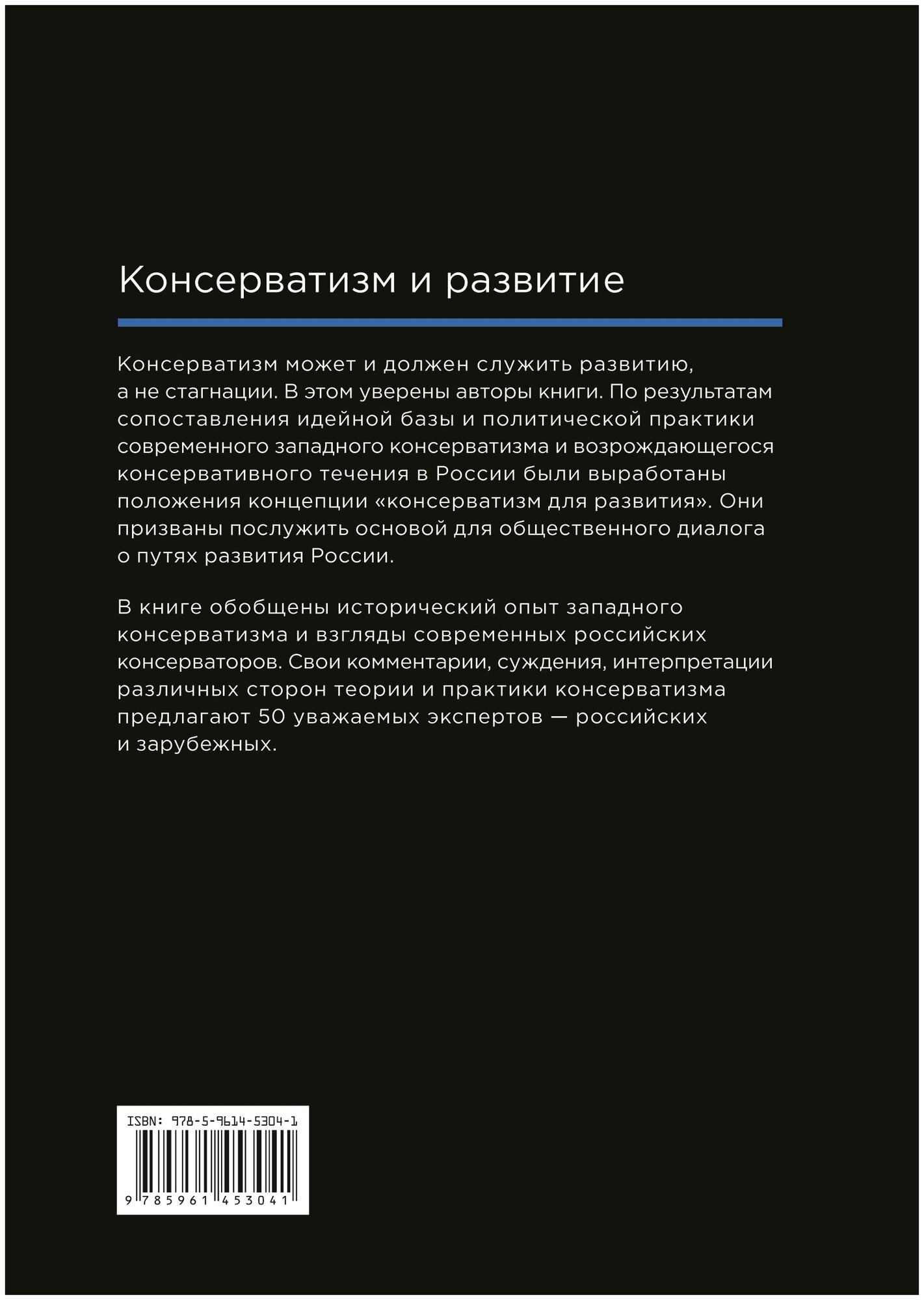 Книга о современном политическом консерватизме на Западе и возрождающемся консервативном течении в России. Замысел исследования состоит в сопоставлении идейной базы и политической практики современного политического консерватизма на Западе, отслеживании тенденции его развития и общественно-политических факторов, определяющих его состояние, и возрождающегося консервативного течения в России. На базе этого сопоставления предложены наиболее значимые положения концепции «консерватизм для развития», которые могли бы служить основой для диалога гражданского общества о путях развития России. В книге обобщены исторический опыт западного консерватизма и взгляды современных российских консерваторов. Комментарии, суждения, интерпретации различных сторон теории и практики консерватизма принадлежат 50 уважаемым экспертам — российским и зарубежным.