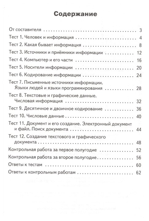Представленные контрольно-измерительные материалы (КИМы) для 2 класса тематически сгруппированы, соответствуют требованиям школьной программы по информатике и требованиям ФГОС. Использование КИМов позволит оценить уровень усвоения обучающимися материала по каждой теме, а также подготовить их к тестовой форме проверки знаний, что поможет в дальнейшем успешно выполнить задания итоговой аттестации. В конце издания представлены ответы ко всем заданиям.