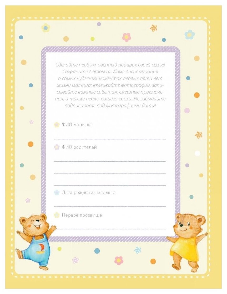 Если вы держите в руках этот альбом для фотографий и записи, значит, вы стали родителями замечательного малыша и, наверняка, сейчас на свете нет никого счастливее вас. Хочется ничего не упустить и сохранить в памяти каждый момент этого удивительного периода - первая улыбка крохи, первое слово, первые шаги, прогулки, праздники… Всего и не перечесть!