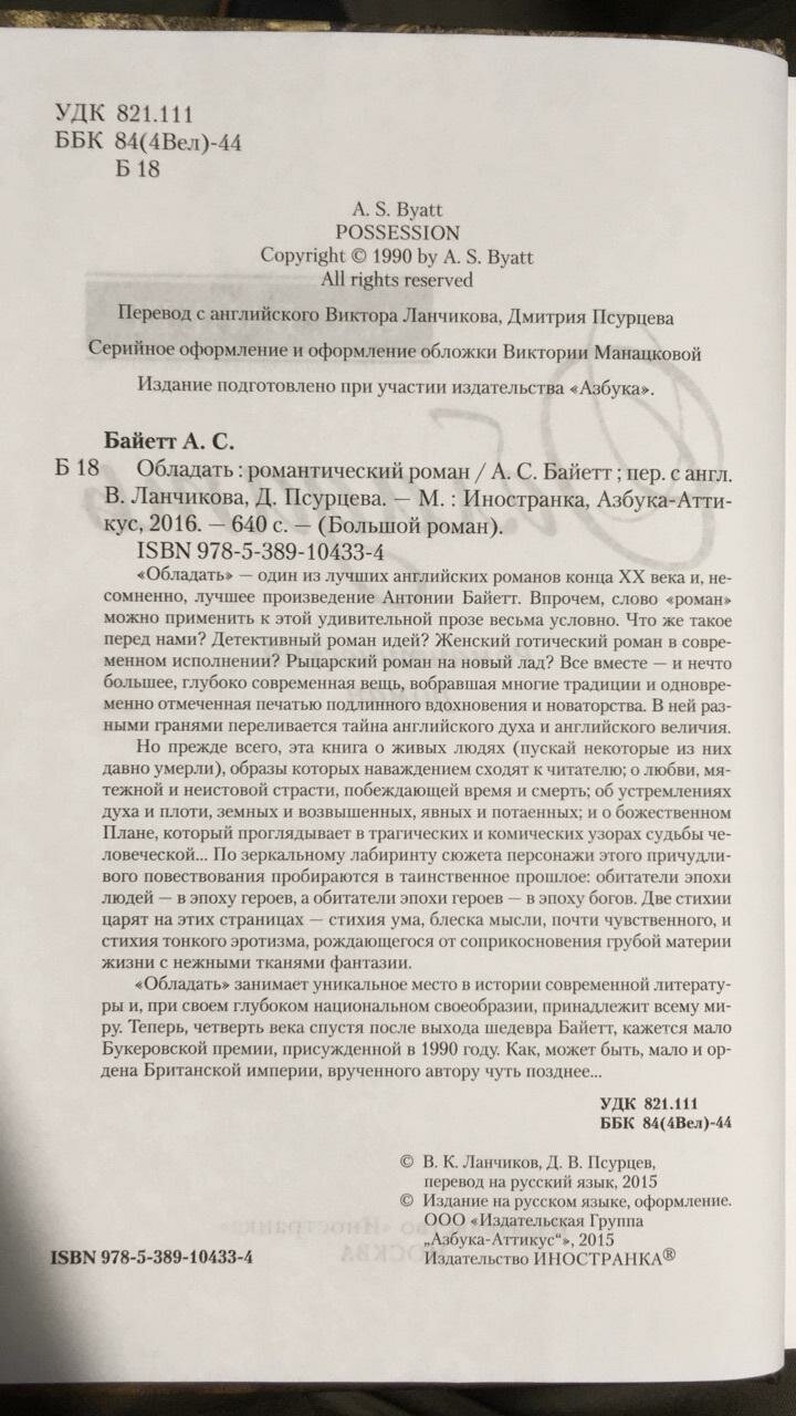"Обладать" занимает уникальное место в истории современной литературы и, при своем глубоком национальном своеобразии, принадлежит всему миру. Теперь, четверть века спустя после выхода шедевра Байетт, кажется мало Букеровской премии, присужденной в 1990 году. Как, может быть, мало и Ордена Британской империи, врученного автору чуть позднее...