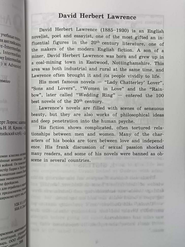 В основу адаптации положен известный роман классика английской литературы Дейвида Герберта Лоренса “Влюбленные женщины”. Действие романа происходит перед Первой мировой войной. Он повествует об истории отношений двух жаждущих страстей сестер Гадран и Урсулы и их возлюбленных. Роман содержит философские концепции самого Лоренса, и отличается психологически тонкими описаниями эмоциональных состояний героев. Многие идеи Лоренс выражает в духе фрейдизма. Книга содержит комментарий, упражнения для отработки и закрепления навыков речевой деятельности, словарь и предназначена учащимся 9-11 классов школ, гимназий, лицеев, а также широкому кругу лиц, изучающих английский язык самостоятельно. Диск в формате CD содержит английский текст книги (без упражнений), начитанный профессиональным диктором - носителем английского языка в учебном темпе