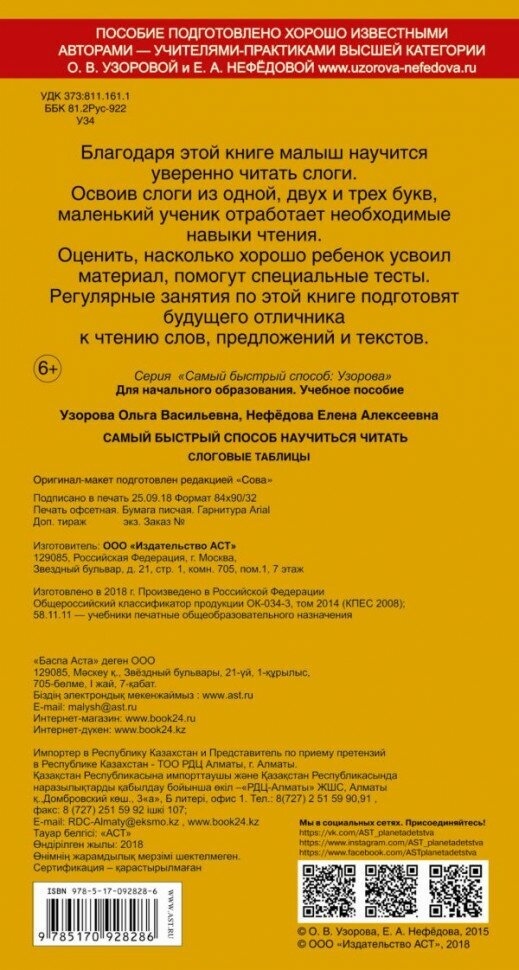 Самый быстрый способ научиться читать. Слоговые таблицы (Нефедова Елена Алексеевна, Узорова Ольга Васильевна); Сова. Малыш (Обучающая и развивающая литература), 2015