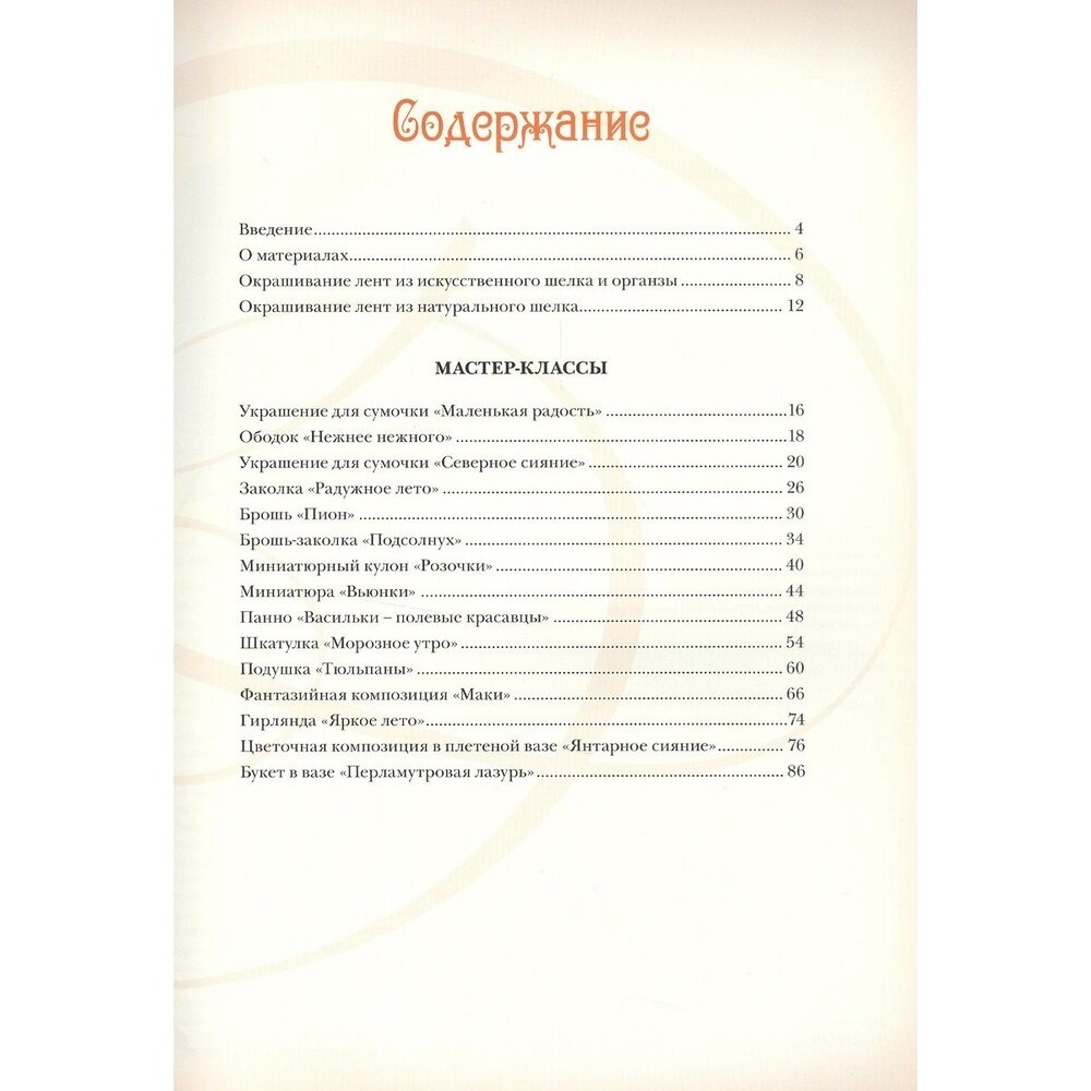 Мастер-классов не очень много, но книга, безусловно, полезная. Каждый МК по созданию дизайнерских украшений, аксессуаров, панно и других композиций сопровождается подробным описанием с иллюстрациями. Техники разные, интересные, в том числе смешанные. Описаны способы окрашивания различных видов лент.