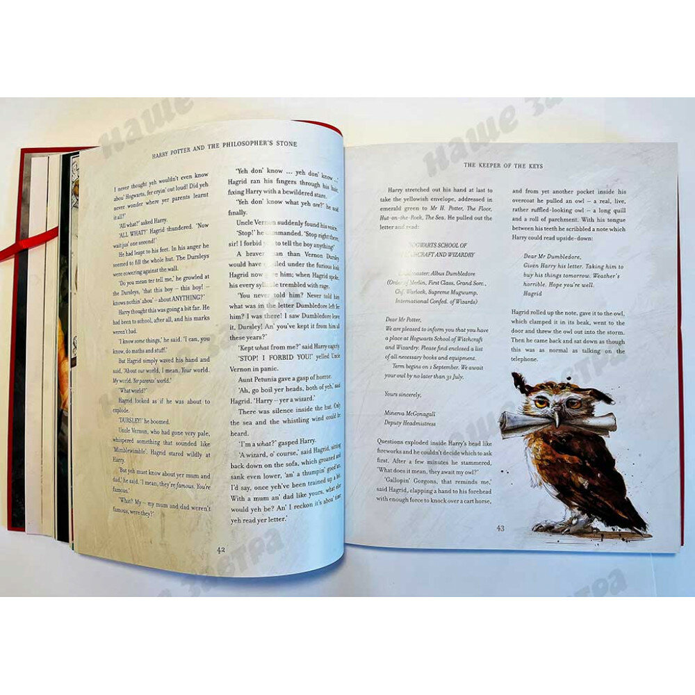 Издание потрясающее, качественная светлая бумага, изумительные яркие иллюстрации. Книга тяжеленькая, внушительная. Жаль только, что под суперобложкой просто красный фон. За такую цену можно было бы и не скупиться на рисунок на твердой обложке. А так крутое издание, фанатам точно Гарри Поттера понравится.