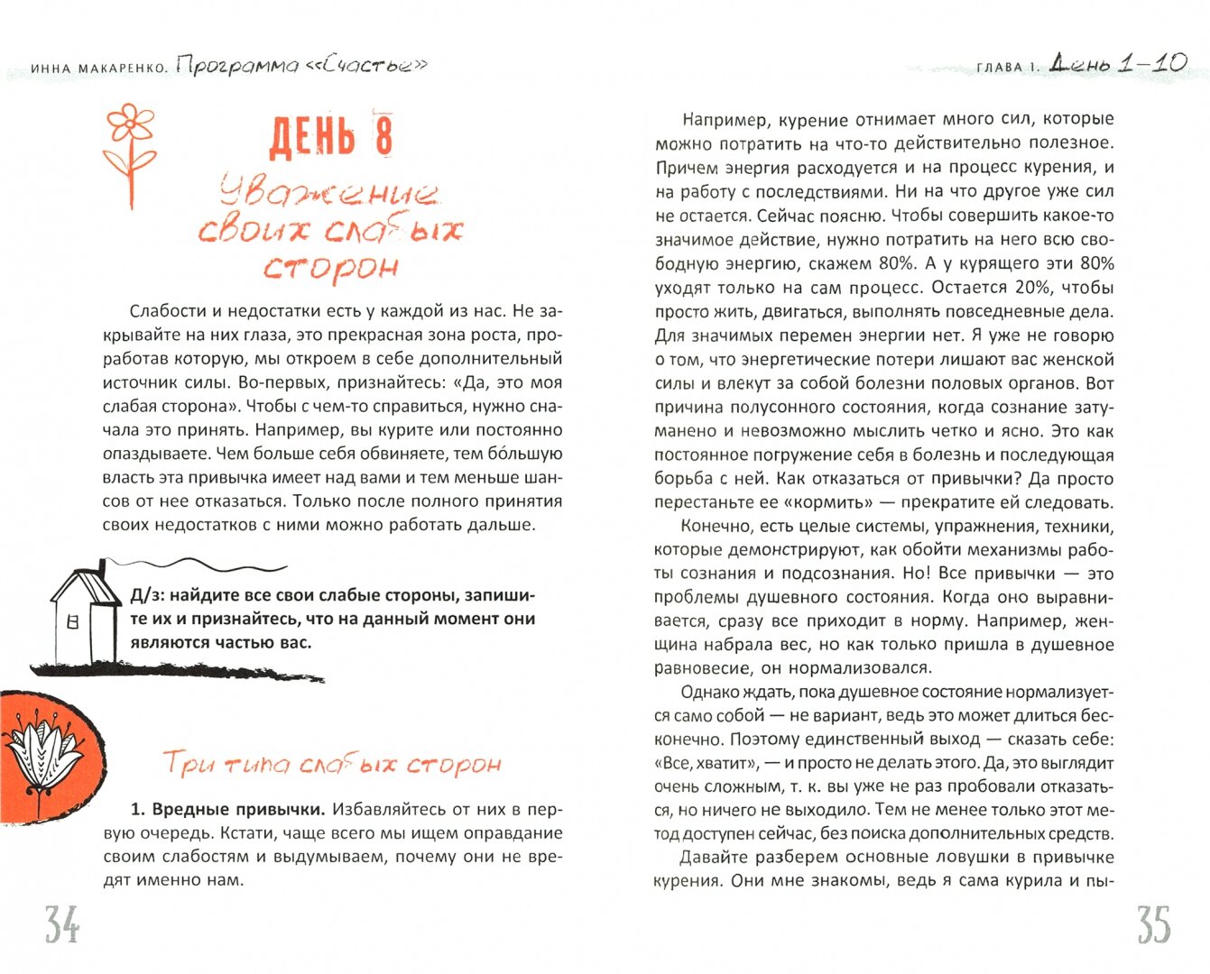 Разработанный Инной Макаренко план по обретению счастья вдохновит вас на то, чтобы начать путь к счастью прямо сейчас — или же на составление своего собственного плана. Благодаря небольшим ежедневным изменениям, вы научитесь эффективнее использовать время, избавитесь от беспокойства и недовольства собой, станете лучшей женой, матерью, другом и коллегой и достигнете всего, что считаете важным и необходимым для счастья.