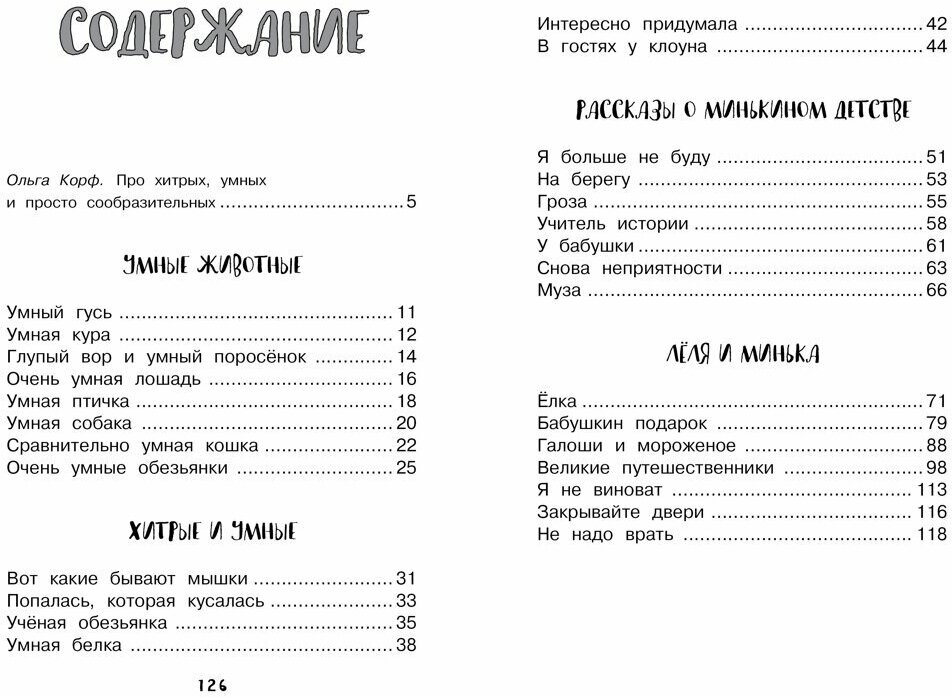 В книге представлены вступительная статья О. Корф и 4 цикла рассказов: умные животные, хитрые и умные, рассказы о Минькином детстве, Лёля и Минька. Формат книги небольшой, бумага белая, слегка просвечивает. Шрифт крупный, читать удобно, подойдет для самостоятельного чтения, буква ё присутствует. Рисунки хорошие, их много, практически на каждой странице, только черно-белые:( Отличная книга за такую невысокую цену!