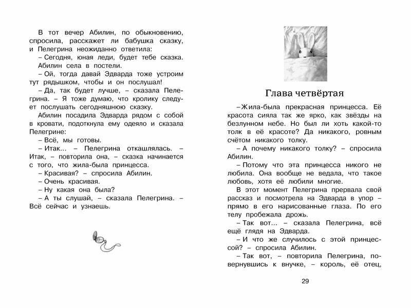 "Однажды жил на свете фарфоровый кролик, которого любила маленькая девочка. Этот кролик отправился в путешествие по океану и упал за борт, но его спас рыбак. Он был погребён в куче мусора, но его отрыла собака. Он долго странствовал с бродягами, но совсем недолго простоял чучелом в огороде… Этот кролик танцевал на улицах Мемфиса. Повар разбил ему голову, а кукольных дел мастер её склеил…" Эта печальная, но светлая история кролика Эдварда не оставит равнодушным ни взрослых, ни детей. Любовь, доброта, сострадание - вот главные темы повести, которая обязательно тронет сердце читателей.