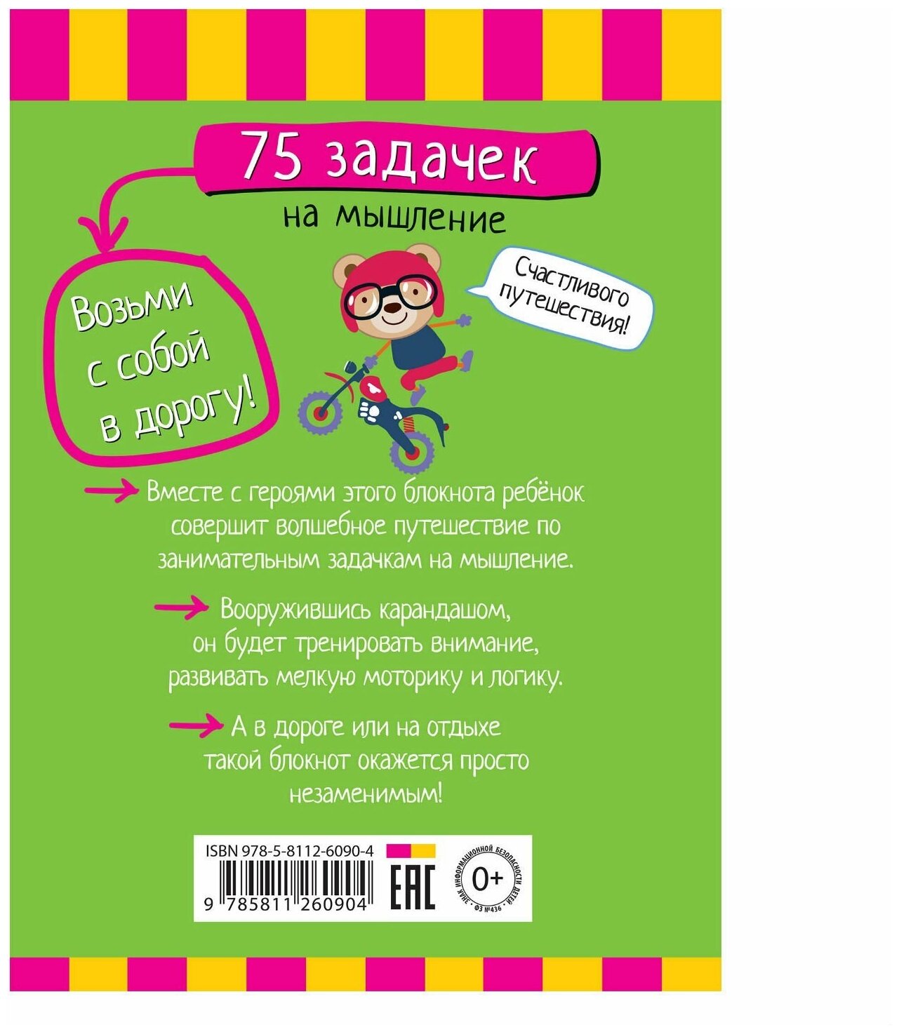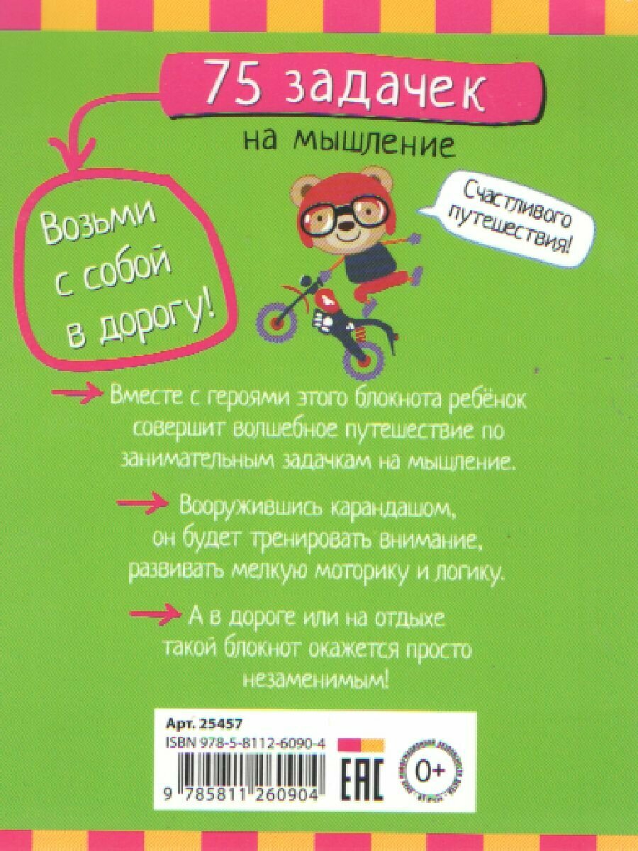 Просто суперская серия блокнотов! Маленький формат позволяет без труда брать его с собой всегда и везде. Ребенок с огромным удовольствием отвлечется на яркий, красочный блокнот и проведет с пользой свободное время! 75 задачек на мышление это увлекательные картинки в которых нужно найти ошибки, "неправильности" или "несуразности"; подобрать пару или соединить линиями основной предмет с его деталями;расставить картинки в правильном порядке; задачи - шутки и другие логические задания на сообразительность и внимание. Отлично привлекает внимание других детей и у вашего ребенка быстро появится компания. На всякий случай в конце блокнота есть ответы на все задания.