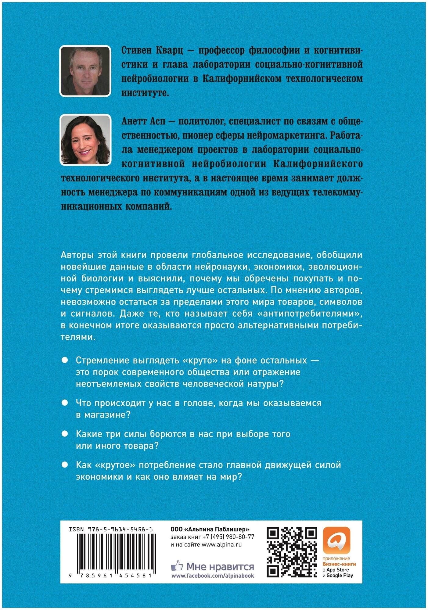 Потребительство, стремление выглядеть "круто" на фоне остальных - это порок современного общества или отражение неотъемлемых свойств человеческой натуры? Даже те, кто называет себя "антипотребителями", в конечном итоге оказываются просто альтернативными потребителями. Авторы этой книги провели глобальное исследование, обобщили новейшие данные в области нейронауки, экономики, эволюционной биологии и выяснили, почему мы просто обречены покупать и почему стремимся выглядеть лучше остальных. По мнению авторов, невозможно остаться за пределами этого мира товаров, символов и сигналов. Что происходит у нас в голове, когда мы оказываемся в магазине? Какие три силы борются в нас при выборе того или иного товара? Как "крутое" потребление стало главной движущей силой экономики и как оно влияет на мир? Об этом рассказывают профессор философии и когнитивной науки Стивен Кварц и политолог, специалист в области PR Анетт Асп.