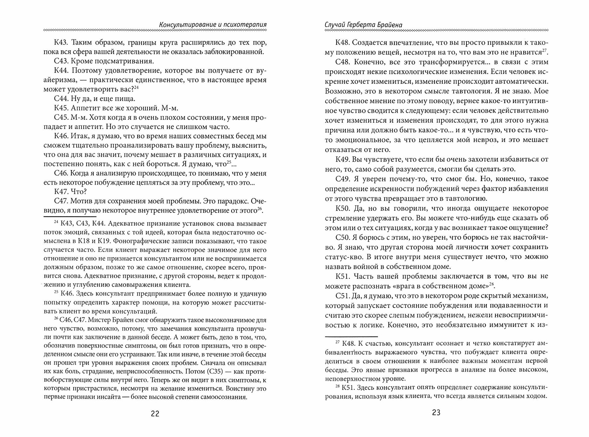 Это заключительная часть книги Карла Роджерса "Консультирование и психотерапия", которая публикуется отдельно в виду ее самостоятельной ценности. Такое разделение единой работы было осуществлено с ориентацией на читателя, хорошо знакомого с концепцией Роджерса и не нуждающегося в "повторении пройденного", но интересующегося практическим применением клиент-центрированного подхода. Настоящая книга представляет собой первую в истории психологии публикацию записанных от начала до конца бесед консультанта с клиентом, составляющих полный, завершенный курс психотерапии. До того в печатных работах приводились лишь фрагменты таких бесед, и Роджерс первым решил представить полный отчет о взаимодействии психотерапевта и клиента, снабдив его собственными комментариями и пояснениями. В результате мы имеем прекрасную и убедительную иллюстрацию представлений Роджерса о том, какой должна быть психотерапия.