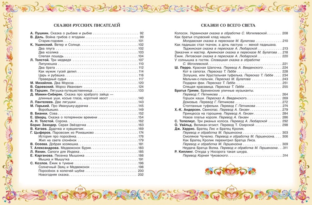 В сборник вошло 100 лучших сказок. Это и русские народные сказки, и украинские, армянские, словацкие, таджикские, и сказки русских писателей: А.С. Пушкина, Л.Н. Толстого, В.М. Гаршина, В.Ф. Одоевского, Л. Пантелеева, Бориса Заходера, В.П. Катаева, Г.М. Цыферова, С.Г. Козлова. И, конечно, сказки знаменитых зарубежных сказочников: Шарля Перро, братьев Гримм, Х.-К. Андерсена. Здесь собраны сказки на любой вкус и для малышей, и для тех, кто постарше, и нет сомнений, что эта книга будет радовать вас долгие годы. Художники: Н. Бугославская, Е. Борисова, М. Волкова и другие. Пересказ А. Введенского, Т. Габбе, М. Булатова и др.
