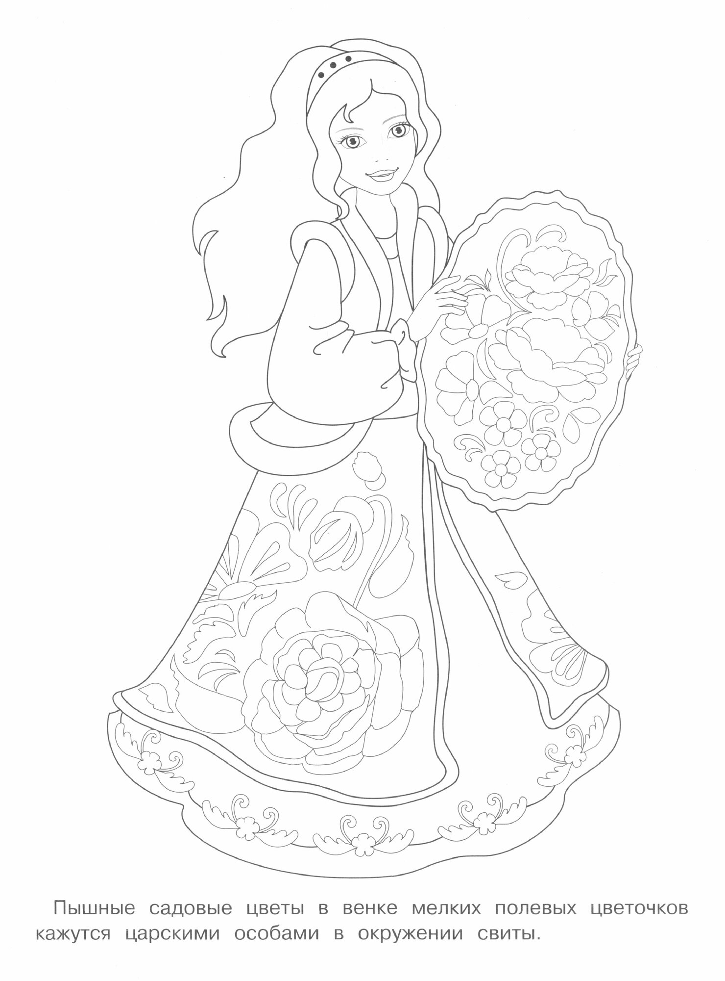 Вся серия раскрасок очень красивая! На одной стороне нарисована девушка в сарафане с определенным орнаментом в цвете, на другой - она же, но в ч/б цвете, для раскрашивания.