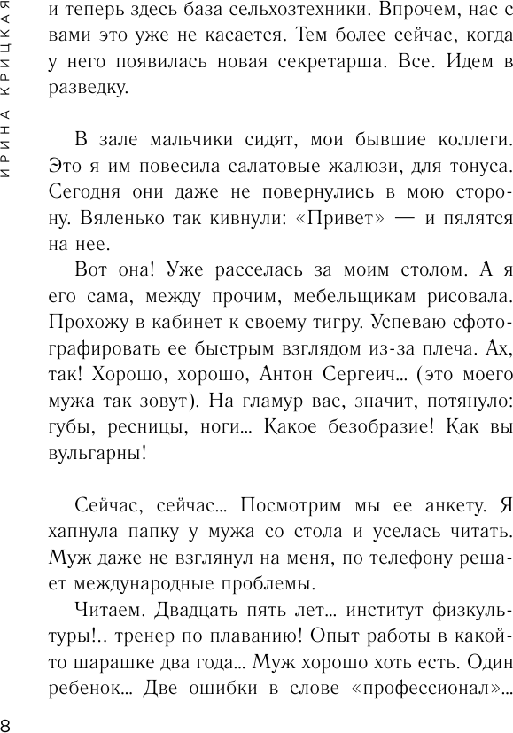 Однообразная, скучная (лично для меня) книга. Если начало захватило - жена с двумя детьми, умница, красавица, когда-то работавшая в подчинении своего мужа, теперь сидит с детьми и яростно ревнует своего мужа к новой секретарше, - страница за страницей, читаешь ее переживания и метания души, как она ловит его знаки внимания, как боится его измен... Но вдруг появляется усталость от чтения одного и того же, и пропадает интерес к тому, что будет дальше. На фоне происходящего вплетаются воспоминания о ее первой любви, их встречи, надежды, разлука, вперемешку с ее сегодняшним днем и историей отношений с мужем. Яркое название книги, но не более того.