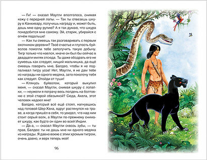 Одна из любимых книг детства. Захотелось освежить в памяти воспоминания, ощущения, а, кроме того, в будущем и ребенку почитать, и я приобрела эту книгу. Несмотря на невысокую цену издания, здесь довольно много картинок хорошего качества, то есть ребенку будет не особо скучно читать. Шрифт в книге достаточно крупный, страницы на хорошей белой бумаге, а главное, что меня привлекло, - это то, что "Маугли" здесь без сокращений напечатан, потому что во многих других детских изданиях произведение почему-то адаптировано и даётся в сокращённом варианте. Думаю, эта книга - подходящий выбор для чтения ребенку лет семи и старше, особенно для мальчиков, рано начинающих интересоваться приключениями.