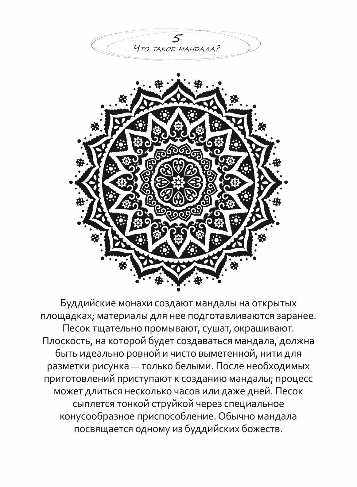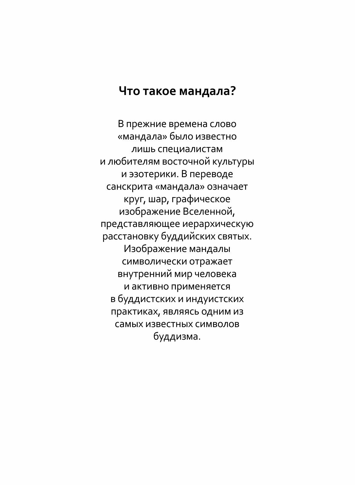 В переводе с санскрита «мандала» означает центр, окружность и издавна имеет духовный смысл символического отражения внутреннего мира человека. В переводе с санскрита «мандала» означает центр, окружность и издавна имеет духовный смысл символического отражения внутреннего мира человека. Мандала — это не просто слово, а целое направление в арт-терапии, позволяющее исследовать наше внутреннее «я», инструмент, который используется не только в индивидуальной, но и в групповой психологической работе. Рисуя мандалу, человек передает своё внутреннее состояние на листке бумаги. Не бывает одинаковых мандал так же, как не бывает одинаковых людей. Мандала позволяет погрузиться в бессознательное и достичь внутренней целостности. Она помогает «навести порядок» внутри психической вселенной человека. Эта книга научит основам рисования собственной мандалы и позволит расслабиться, раскрашивая уже готовые рисунки.