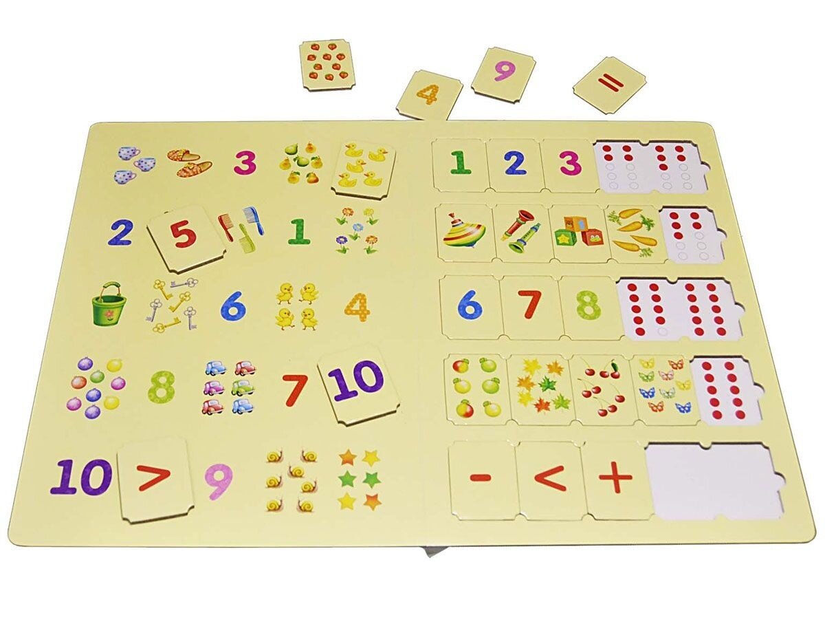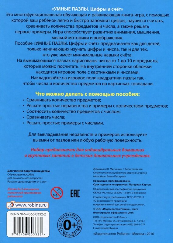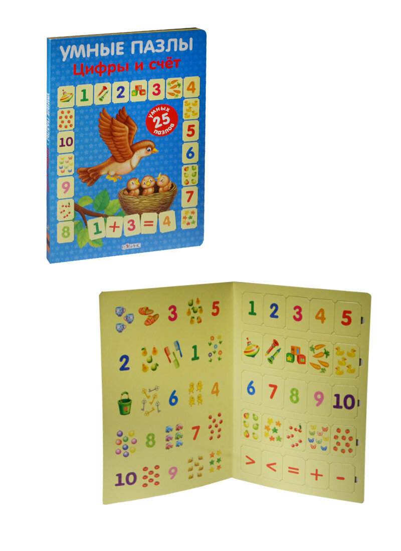 Это многофункциональная обучающая и развивающая книга-игра, с помощью которой ваш ребёнок легко и быстро запомнит цифры, научится считать, сравнивать количества предметов и числа, а также решать первые примеры. Игра способствует развитию внимания, мышления, мелкой моторики и воображения. Пособие «УМНЫЕ ПАЗЛЫ. Цифры и счёт» предназначен как для детей, только начинающих изучать цифры и числа, так и для тех, кто уже имеет минимальные навыки счёта. На вынимающихся пазлах нарисованы числа от 1 до 10 и предметы, которые можно посчитать. На внутренней сторонке обложки находится игровое поле с картинками и числами. Накладывайте на игровое поле квадратики-пазлы так, чтобы числа и количество предметов на картинках совпадали.