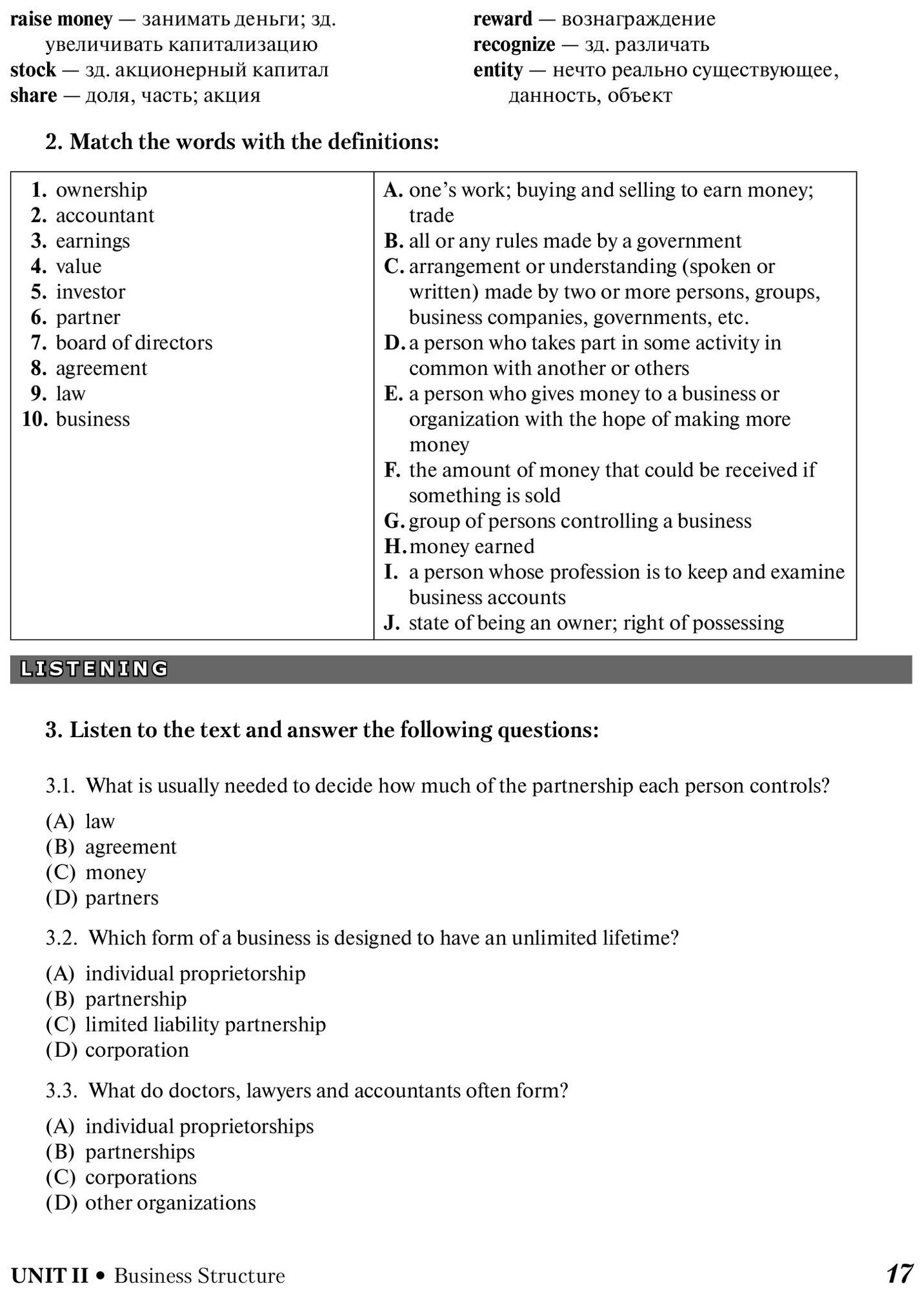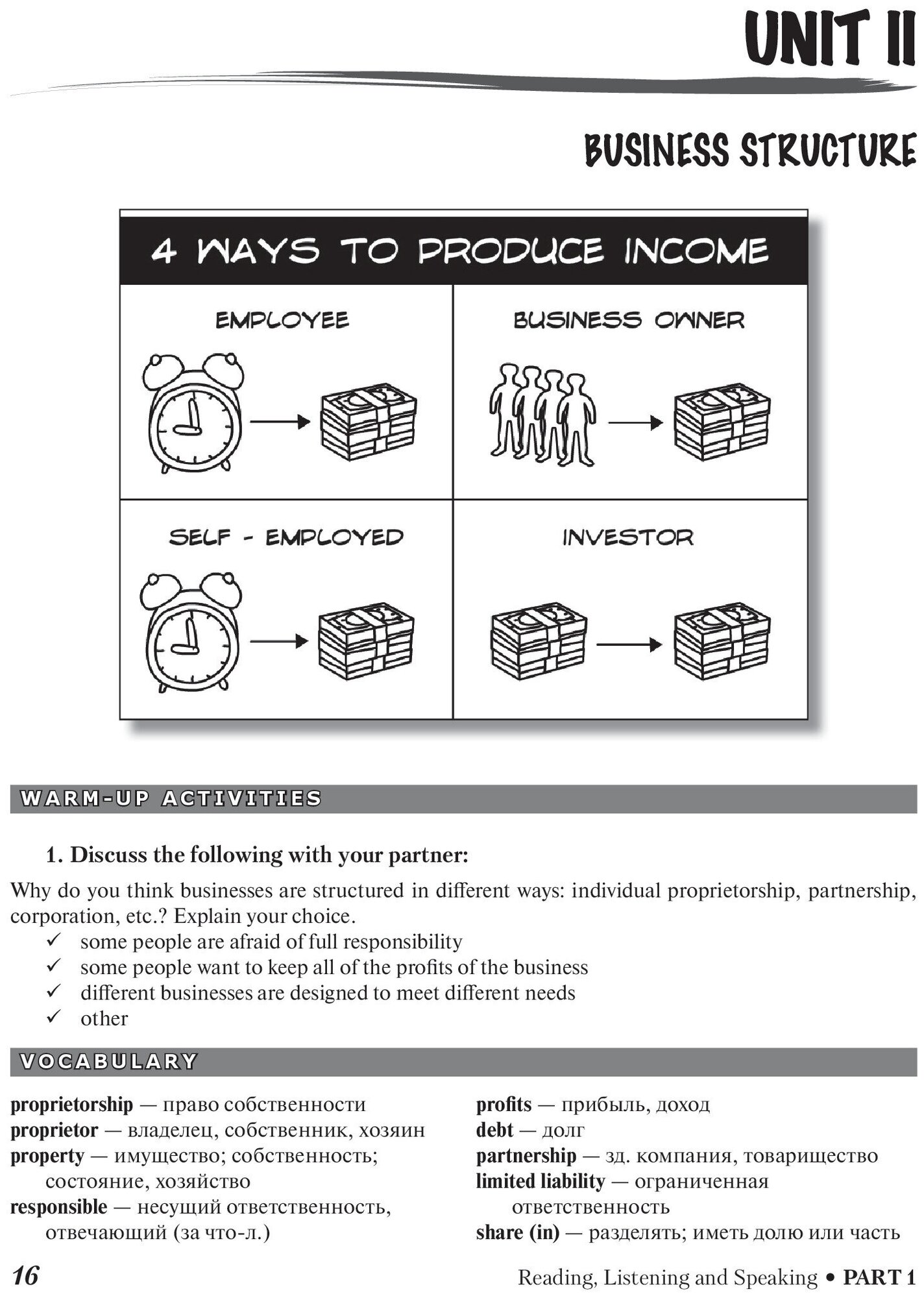 Учебное пособие "Английский язык для экономических специальностей" адресовано студентам экономических факультетов высших учебных заведений и предназначено для комплексного формирования стратегий овладения языком как в рамках аудиторных занятий, так и в процессе самостоятельной подготовки. Пособие состоит из двух частей. Первая часть состоит из 15 разделов, каждый из которых содержит аутентичный текст и упражнения, позволяющие отрабатывать навыки аудирования и говорения, проверить понимание полученной информации, расширить словарный запас. Вторая часть состоит из семи разделов, в которых предлагаются следующие задания: заполнение анкет, написание деловых и личных писем, составление резюме, меморандума.