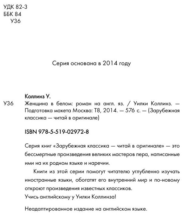 Книги из этой серии помогут читателю углубленно изучать иностранные языки, обогатят его внутренний мир и по-новому откроют произведения известных классиков. Учись английскому у Уилки Коллинза!