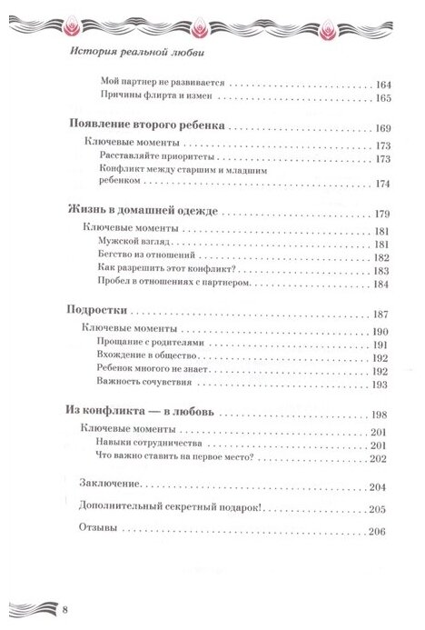 Авторы дают исчерпывающие комментарии ко всем ключевым моментам в отношениях пары: знакомство, свадьба, рождение детей и их воспитание, отношения с родителями, конфликты, недопонимание, флирт на стороне, ссоры и примирения. В конце каждого раздела вы найдете профессиональные советы о том, как преодолевать трудности семейной жизни. Вы узнаете о самых распространенных причинах размолвок между супругами, научитесь выходить из конфликтных ситуаций и извлекать из них ценные уроки, станете с большим пониманием и уважением относиться к своему партнеру, что позволит вам сохранить любовь в отношениях и пронести ее через годы семейной жизни.