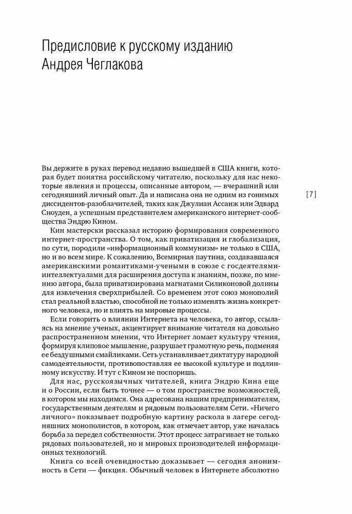 Раскрыть глаза человечеству взялся Эндрю Кин, которого в Кремниевой долине назвали Антихристом за резкую критику плутократов вроде Марка Цукерберга, зарабатывающих несметные богатства на использовании персональных данных обычных пользователей. Кин рассказывает, как владельцы Google, Facebook, Twitter, Instagram, прочих «цифровых гигантов», действуя по принципу «Победитель получает всё», усугубляют безработицу и экономическое неравенство, как интернет-бизнес породил целую индустрию добычи и переработки наших с вами личных данных.