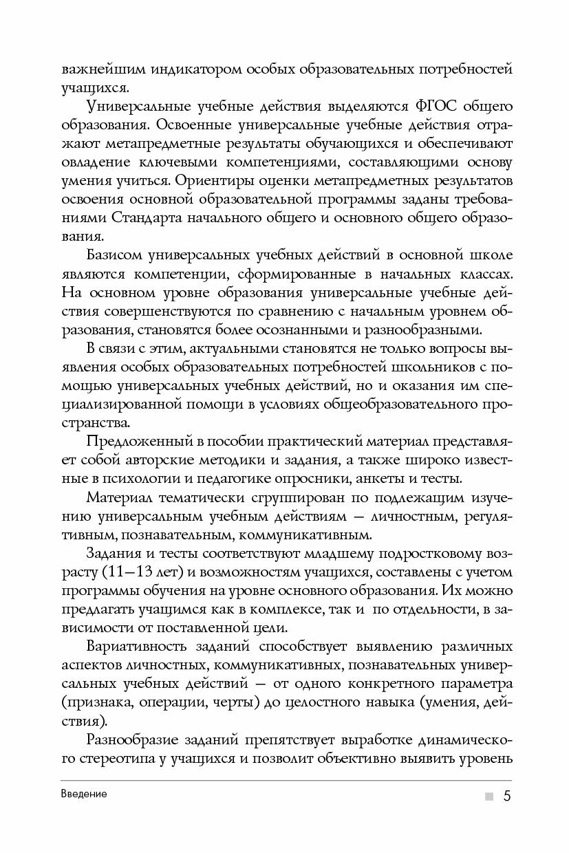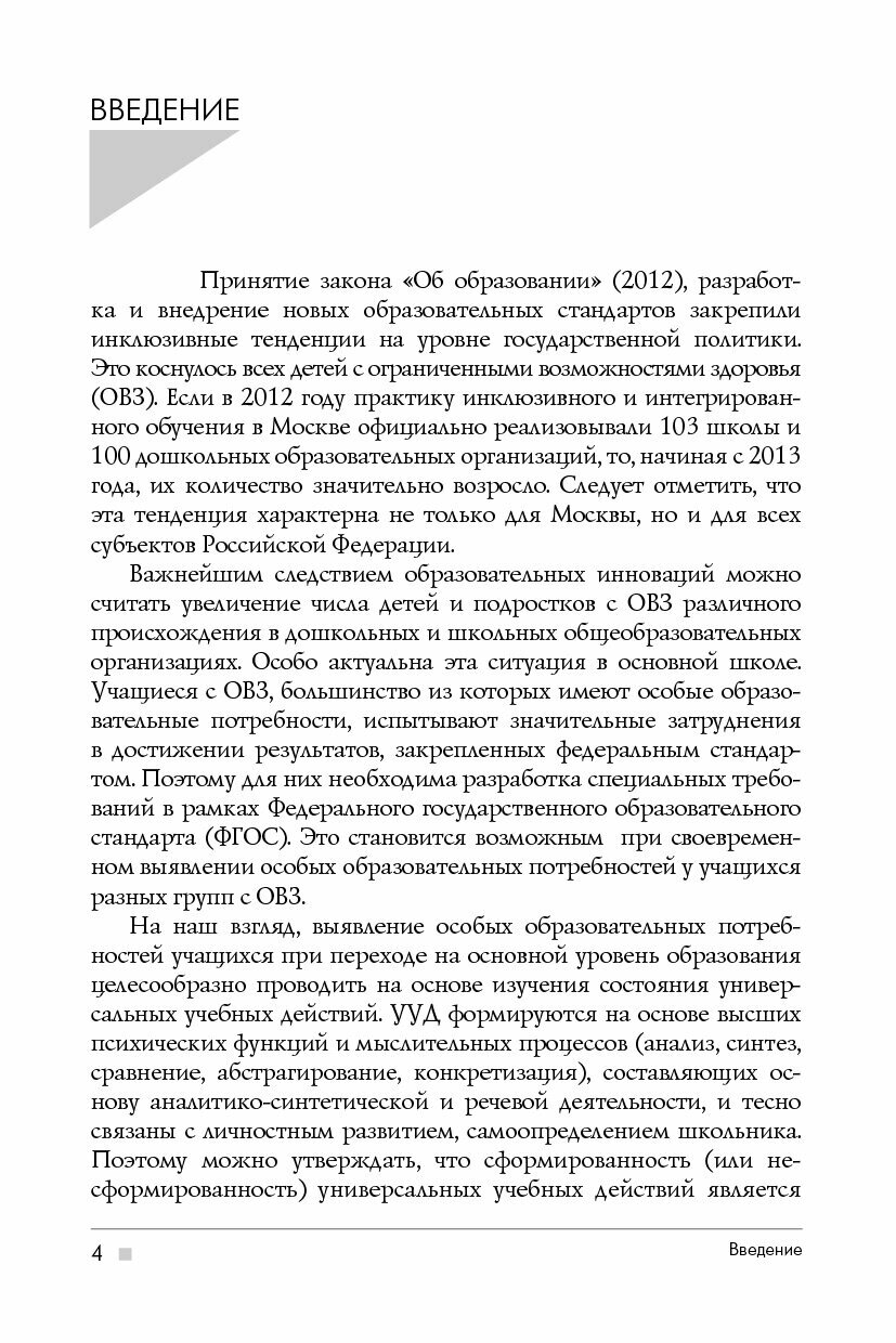 Учебно-методическое пособие знакомит специалистов и педагогов общеобразовательных организаций (школ) с общей характеристикой нормально развивающихся младших подростков; с особыми образовательными потребностями обучающихся с ограниченными возможностями здоровья (ОВЗ) на уровне основного общего образования. Разработан комплекс методических материалов - инструментарий по выявлению сформированности универсальных учебных действий (УУД) (личностных, регулятивных, познавательных, коммуникативных) как индикатора особых образовательных потребностей школьников, имеющих трудности в обучении. Особо акцентируется внимание на особых образовательных потребностях учащихся с ограниченными возможностями здоровья (ОВЗ). Книга адресована специалистам (учителям-логопедам, учителям-дефектологам, психологам), педагогам школ, руководителям общеобразовательных организаций и из заместителям (завучам), координаторам инклюзивного образования, а также студентам, магистрантам и аспирантам педагогических факультетов.