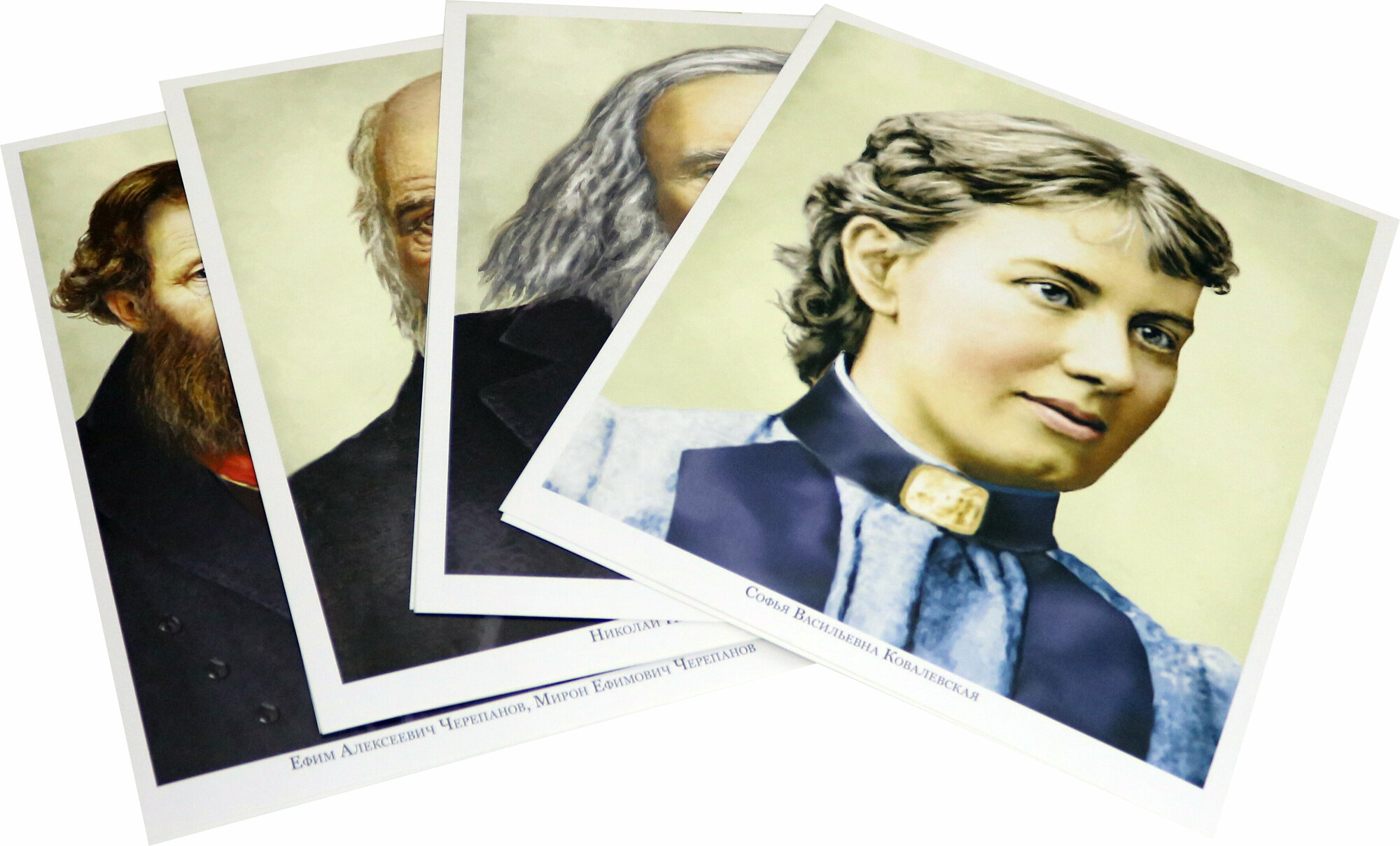 Хорошие портреты. На обратной стороне краткие биографические сведения. Формат небольшой, но бумага картонная, плотная. Мне понравились! Упаковка не очень: обложка открыточного типа, хотелось бы "ушки" сверху и снизу, как в папке, а так хранить не удобно, выпадают.