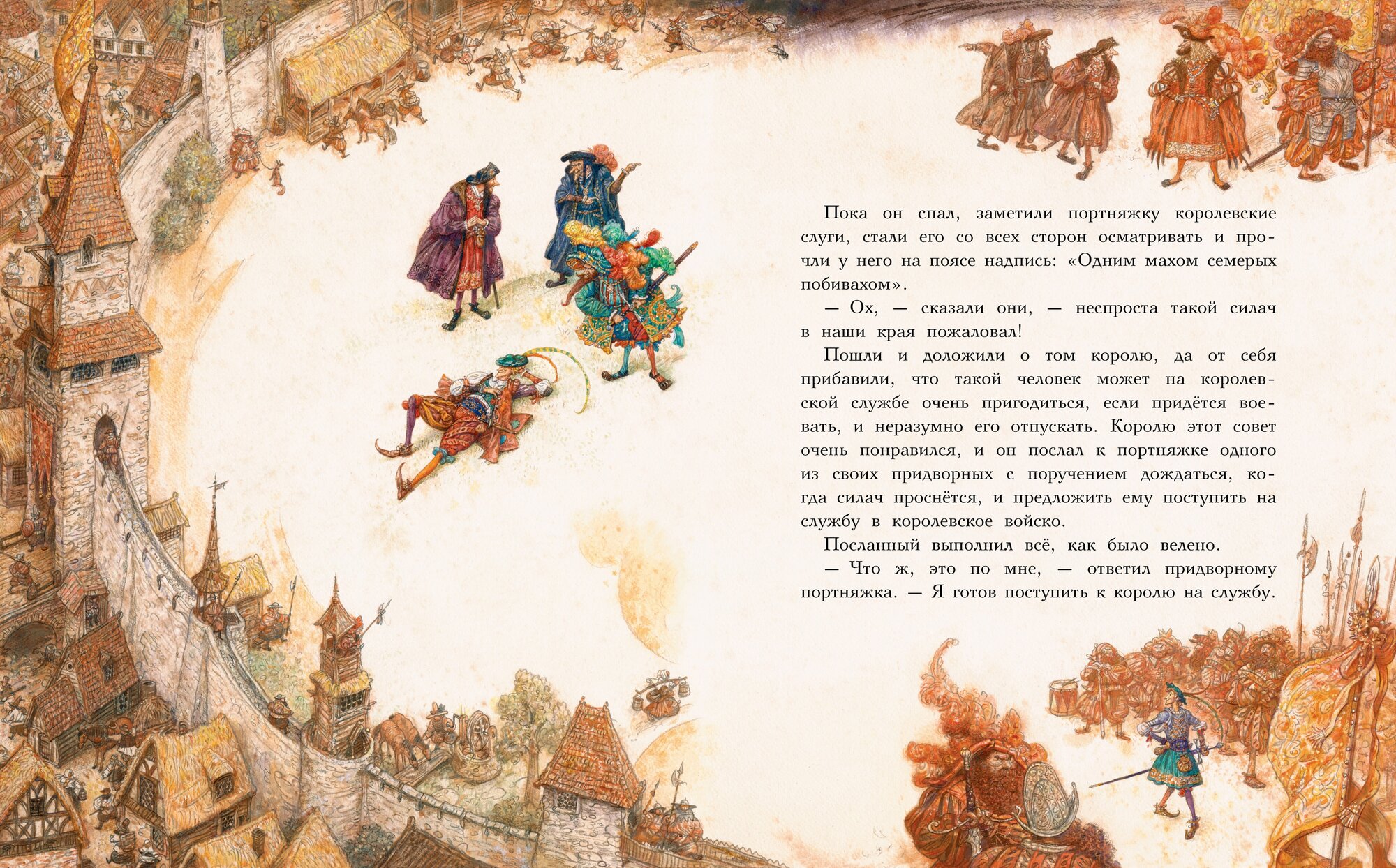 Этот удалец легко расправляется со злобными великанами, укрощает свирепого единорога и загоняет в ловушку огромного вепря. А если попросите, он сошьёт вам брюки и жилет, да такие, что прямо загляденье. У храбреца на поясе вышит знаменитый девиз: "Одним махом семерых побивахом!" Конечно, вы уже узнали храброго портняжку из сказки братьев Гримм. Но старый знакомый найдёт, чем удивить и в этот раз - ведь таким вы его ещё не видели! Яркие, пышные костюмы, забавные и жутковатые физиономии, захватывающая игра и безудержное веселье - всё это вы увидите и почувствуете в новых иллюстрациях блестящего мастера книжной графики Антона Ломаева.