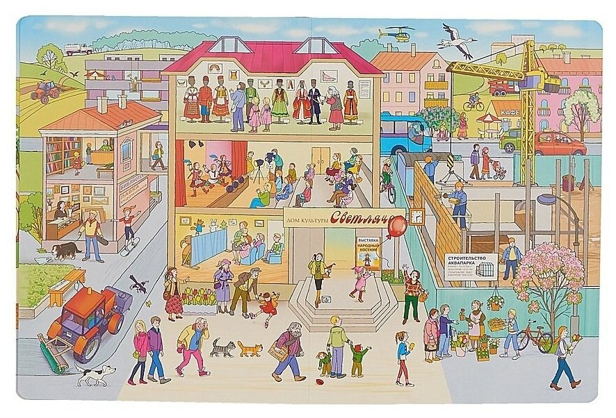 Скорее открывайте эту веселую книгу! Посмотрите сколько здесь персонажей! И с каждым из них происходит какая-то интересная история. В этой книге множество деталей, которые можно рассматривать снова и снова. А еще вы найдете занимательное задания к каждому развороту. Это прекрасное пособие для обучения детей рассказу по картинкам. Оно разовьет воображение, речь и обогатит словарный запас вашего ребенка. В книге практически нет текста, но "читать" ее можно бесконечно.