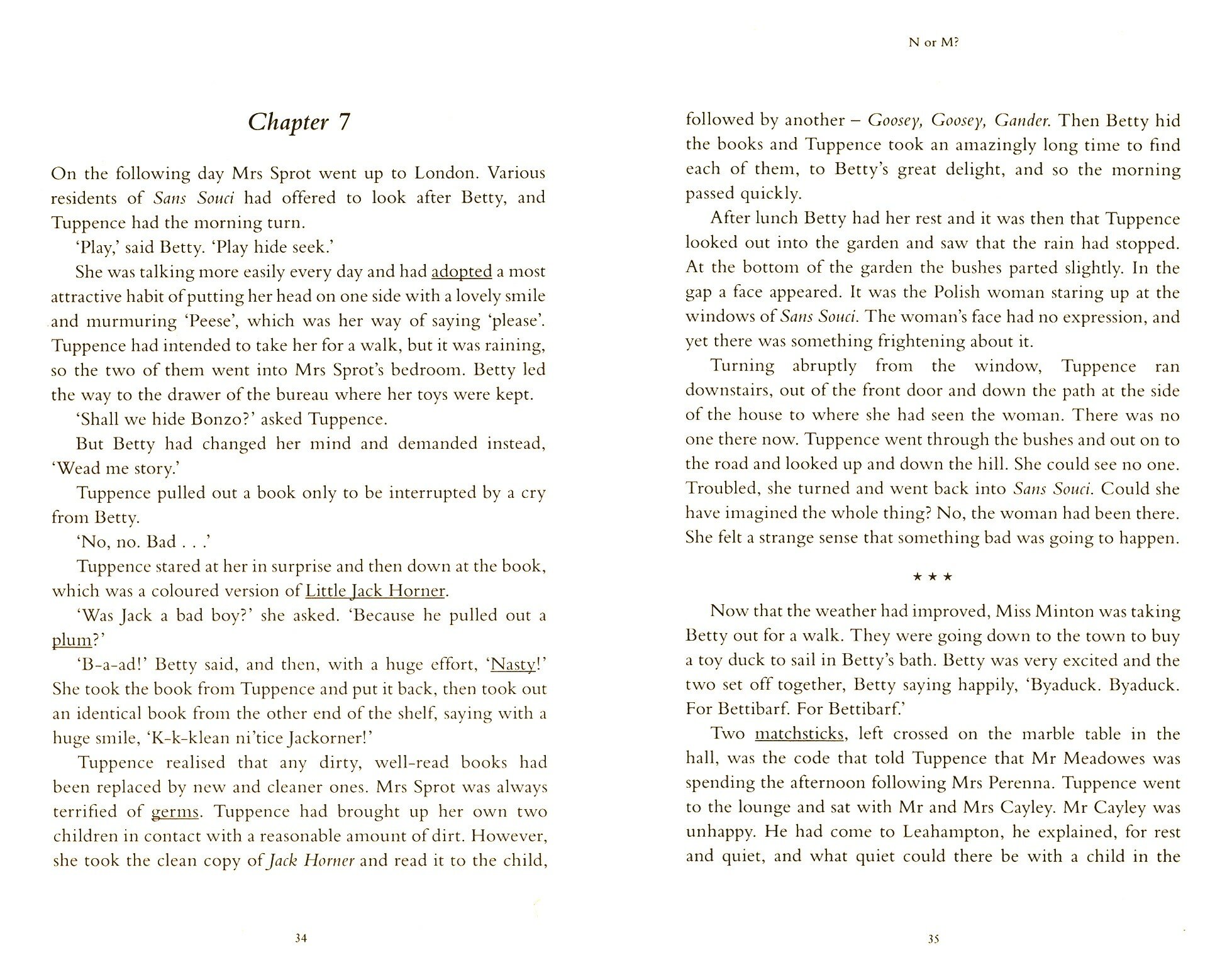 Агата Кристи - мастер романов детективного жанра. Но эта знаменитая британская писательница писала не только об умном Эркюле Пуаро и очаровательной мисс Джейн Марпл. Представленная книга Агаты Кристи рассказывает о периоде Второй мировой войны. В Британии завелись немецкие шпионы, которые выведывают секретную информацию у Объединённого Королевства. К тому же, эти немецкие шпионы убили британских секретных агентов. Правительство Британии знает только, что этих шпионов обозначают кодовыми именами "Н" и "М". Ими может быть любой человек. Единственная зацепка их пребывания ведет в деревню Лигемптон, а именно в переполненный постоялый дом Санс Соуси. Вывести шпионов на чистую воду должны Томи и Тапенс Бересфорд - британские самые необычные агенты контрразведки. Но быть уверенным, что "Н" и "М" будут найдены очень сложно... Мне лично очень понравилась эта книга, пусть и в адаптированном варианте. Многие описания местности и персонажей сокращены, что придает книги сильную динамичность событий. Уверен, что вы сможете по достоинству оценить это произведение.