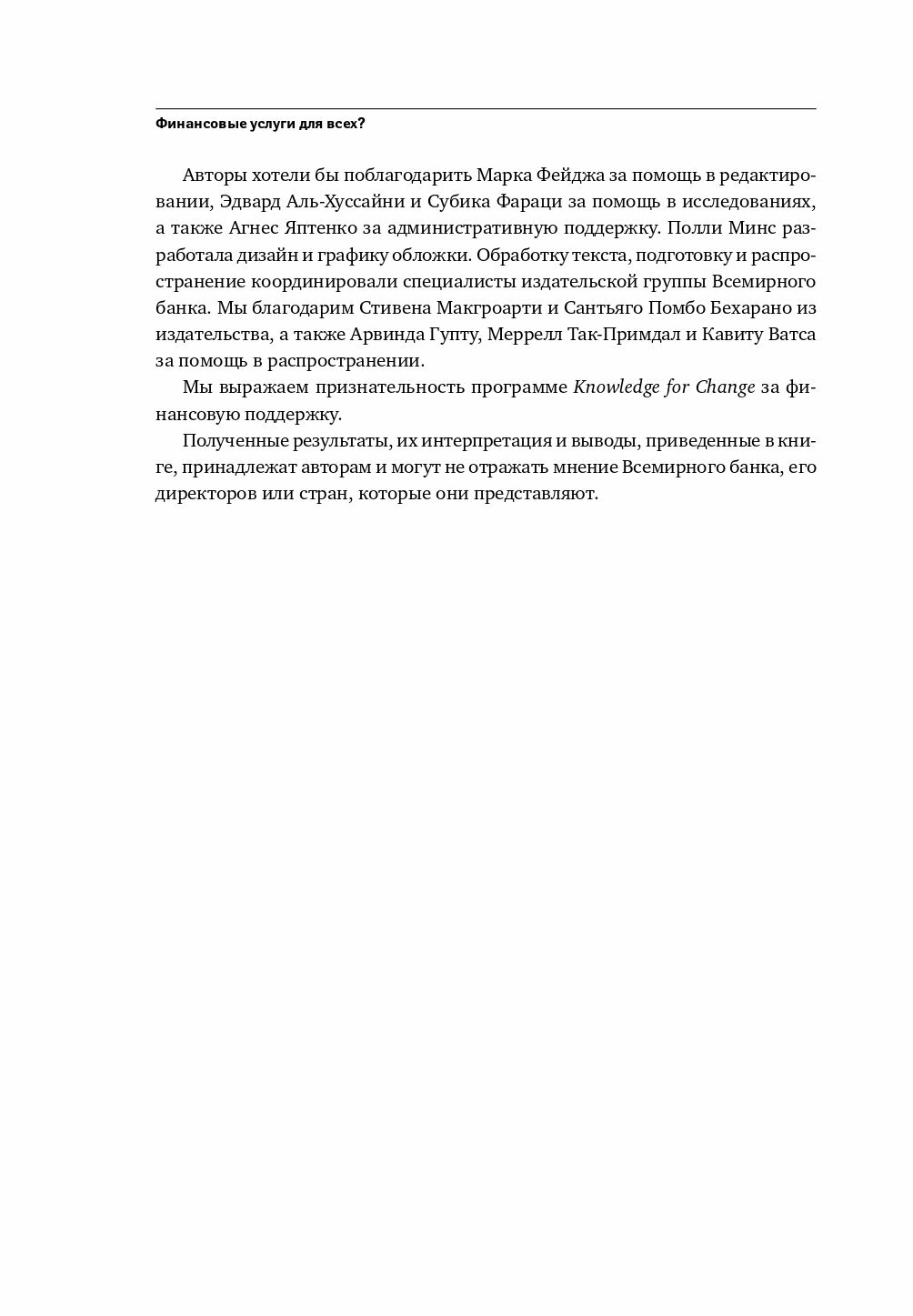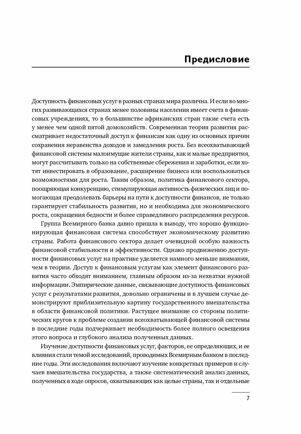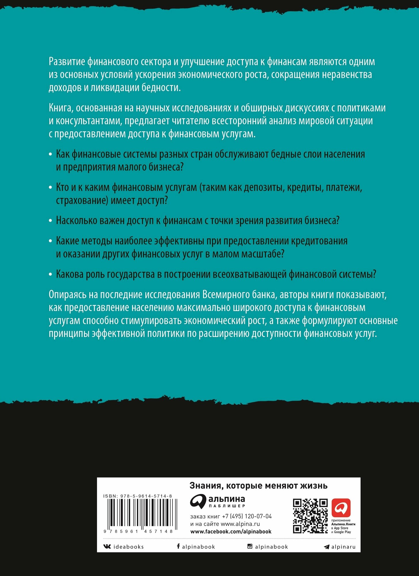 Невозможность получить доступ к финансовым услугам является одной из основных причин сохранения неравенства доходов и медленного экономического роста в самых разных странах мира. Книга «Финансовые услуги для всех» адресована банковским работникам и специалистам в сфере финансов и экономики, преподавателям и студентам экономических вузов. Опираясь на последние исследования Всемирного банка, авторы книги показывают, как предоставление населению максимально широкого доступа к финансовым услугам способно стимулировать экономический рост, а также формулируют основные принципы эффективной политики по расширению доступности финансовых услуг. Книга, основанная на научных исследованиях и обширных дискуссиях с политиками и консультантами, предлагает читателю всесторонний анализ мировой ситуации с предоставлением доступа к финансовым услугам. Как финансовые системы разных стран обслуживают бедные слои населения и предприятия малого бизнеса? Кто и к каким финансовым услугам (таким как депозиты, кредиты, платежи, страхование) имеет доступ? Насколько важен доступ к финансам с точки зрения развития бизнеса? Какие методы наиболее эффективны при предоставлении кредитования и оказании других финансовых услуг в малом масштабе? Какова роль государства в построении всеохватывающей финансовой системы?
