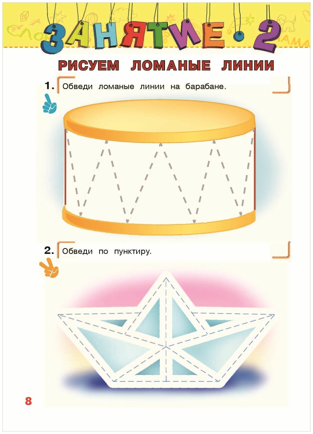 Сначала нужно просто проводить прямые линии, потом ломаные, потом уже с разными изгибами, прямоугольники, треугольники, круги, обвести по точкам и т.д. Параллельно с этим нужно еще отвечать на дополнительные вопросы по картинкам и раскрашивать.