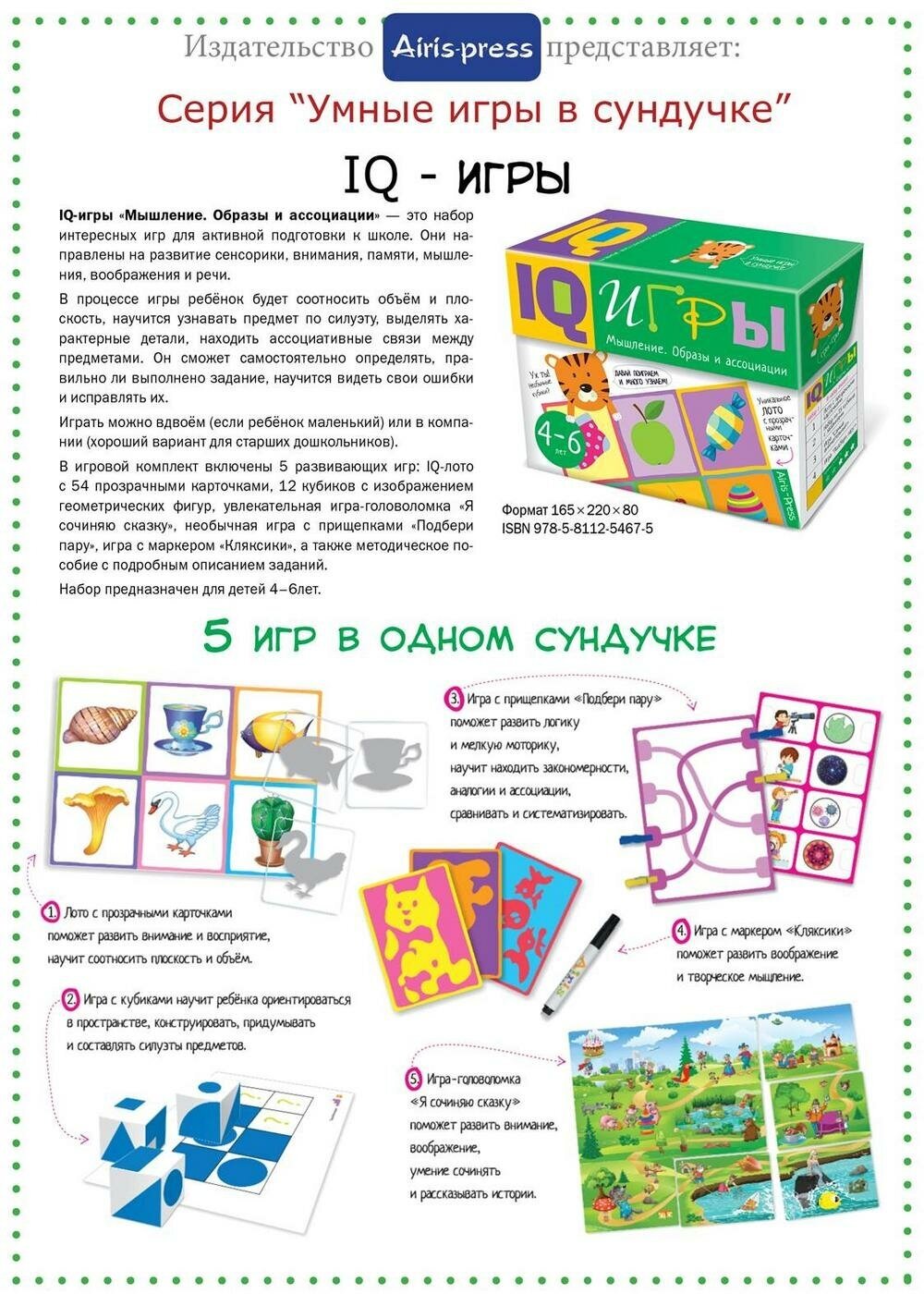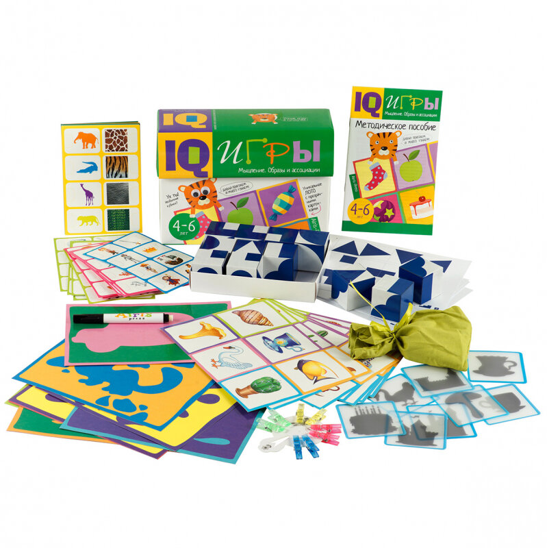 IQ-игры "Мышление. Образы и ассоциации" — это набор интересных игр для активной подготовки к школе. Они направлены на развитие сенсорики, внимания, памяти, мышления, воображения и речи. В процессе игры ребёнок будет соотносить объём и плоскость, научится узнавать предмет по силуэту, выделять характерные детали, находить ассоциативные связи между предметами. Он сможет самостоятельно определять, правильно ли выполнено задание, научится видеть свои ошибки и исправлять их. Играть можно вдвоём (если ребёнок маленький) или в компании (хороший вариант для старших дошкольников). В игровой комплект включены 5 развивающих игр: IQ-лото с 54 прозрачными карточками, 12 кубиков с изображением геометрических фигур, увлекательная игра-головоломка "Я сочиняю сказку", необычная игра с прищепками "Подбери пару", игра с маркером "Кляксики", а также методическое пособие с подробным описанием заданий. Набор предназначен для детей 4-6 лет.