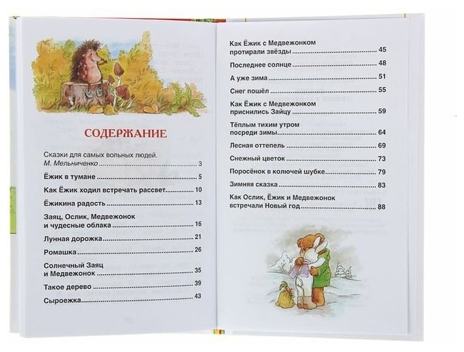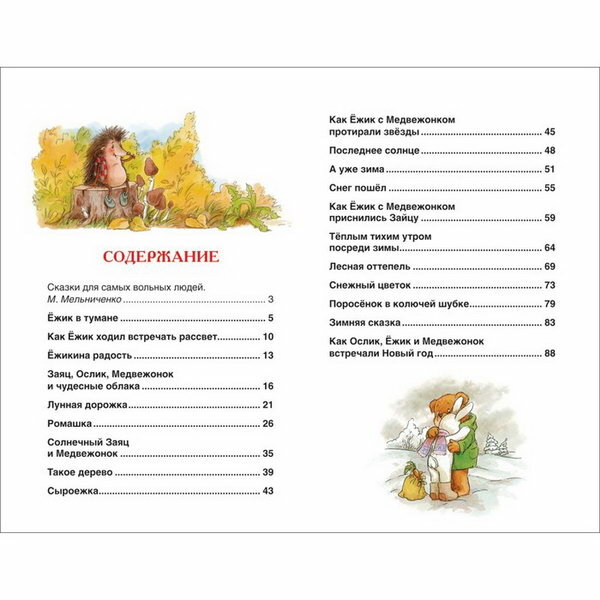 "Сказки о ёжике и медвежонке", очень полюбились сказки Козлова. Знакомства с этим автором началось с этой книге. К большому сожалению мне не знакомы эти замечательные сказки с детства. Теперь это стала одна из любимых книг в нашей библиотеке. У книги удобный формат. Очень люблю это издательство за то, что у них всегда белые листы, плотные, не заминаются. Очень удобно хранить книги на полке. Так как все книги выполнены в одном формате. Смотрится очень красиво когда книги стоят ровно в ряд. Ни чего не вываливается. Говорить и рассказывать о чем сказки. Не вижу смысла. Думаю все знают о их содержании. И очень любимы многим!